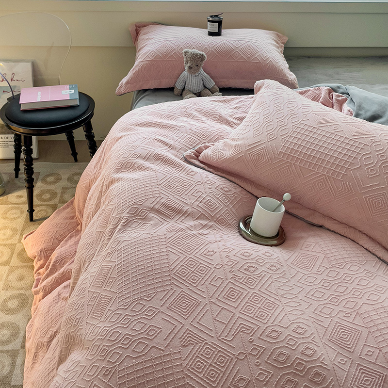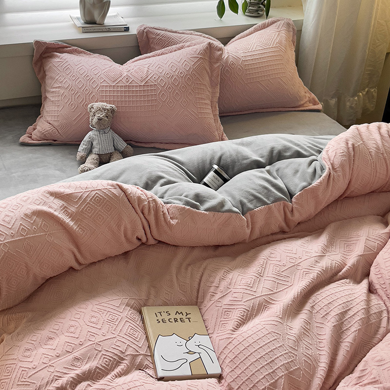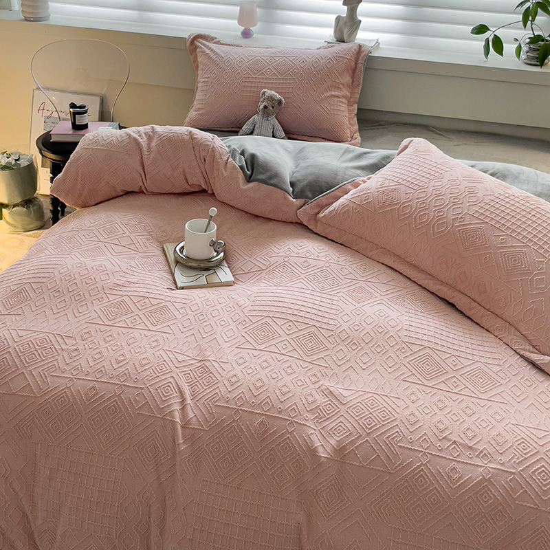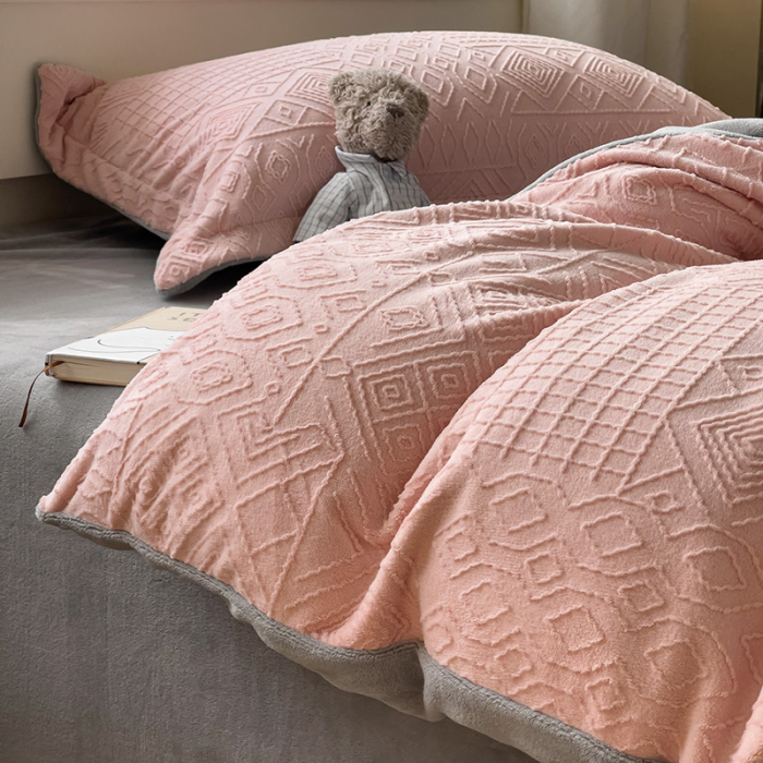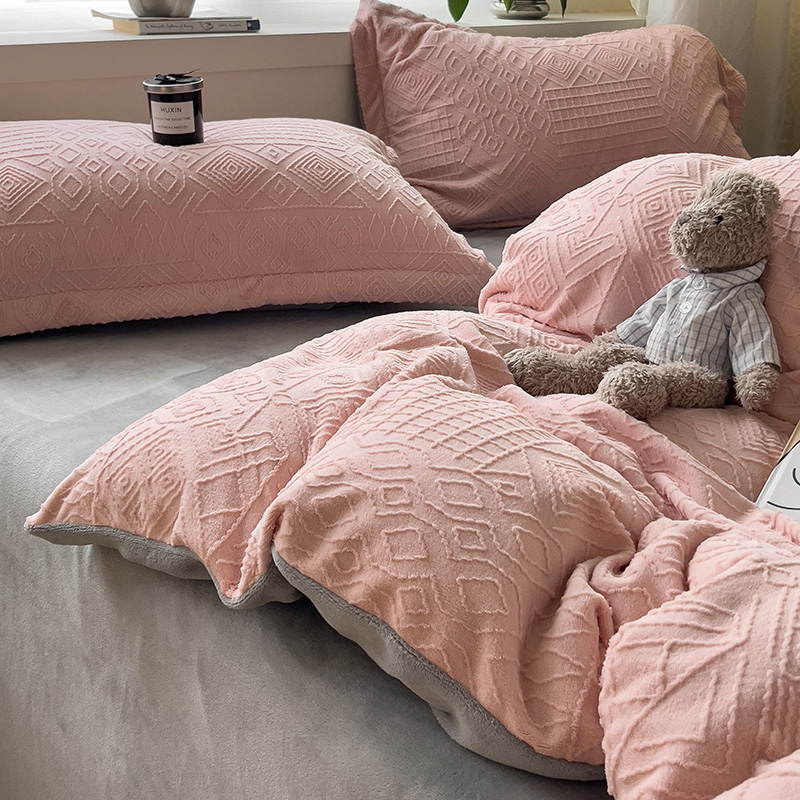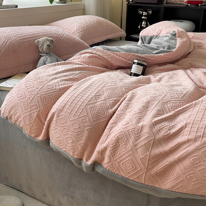 Lenjerie De Pat Cocolino 4 Piese Cu Cearceaf Pat Mare - Gri Si Roz In Relief