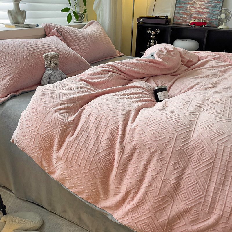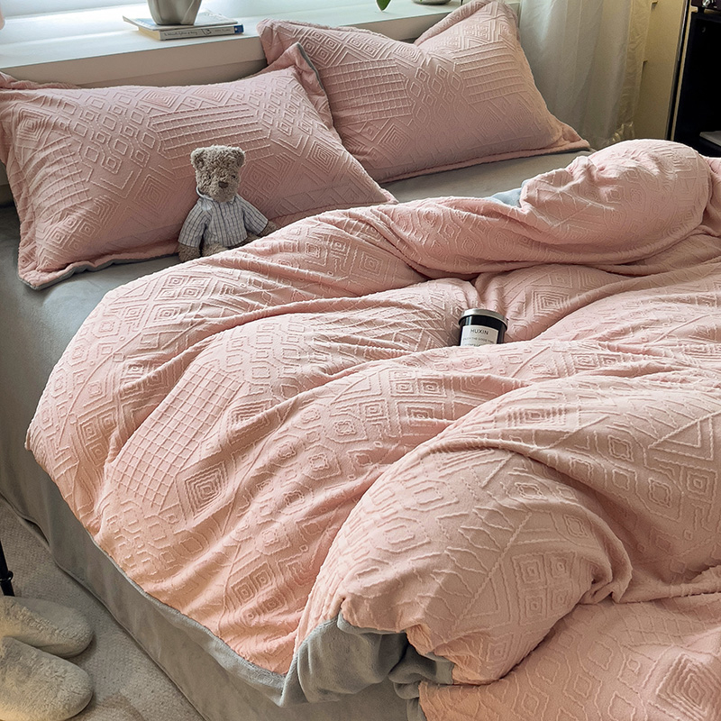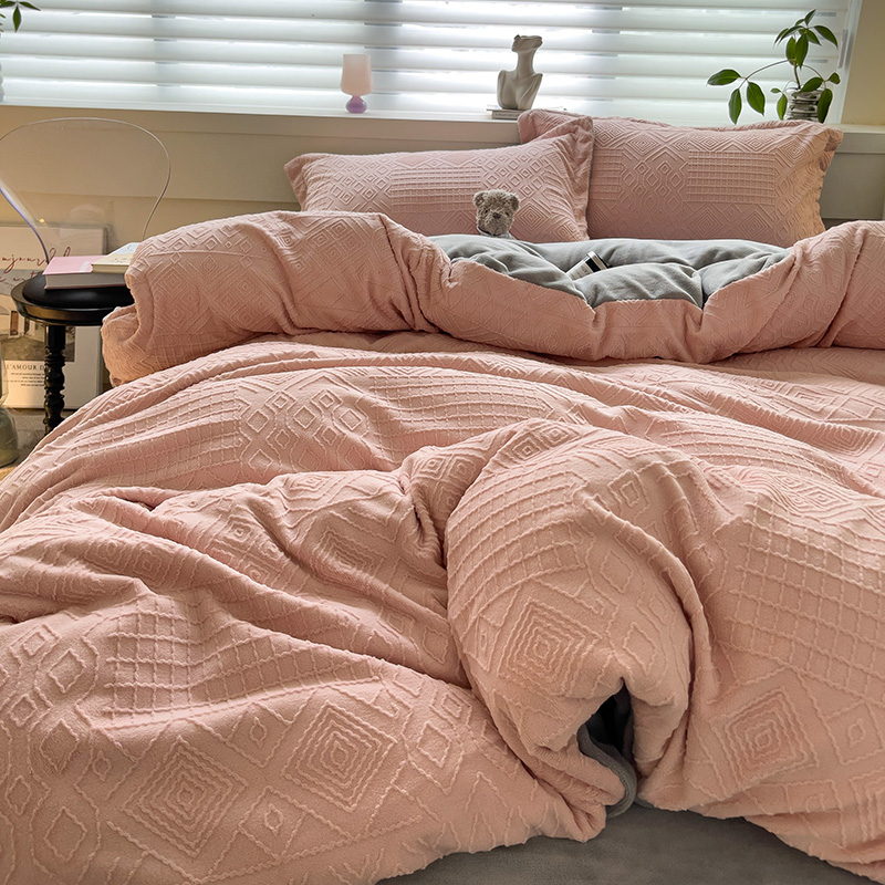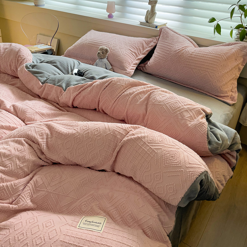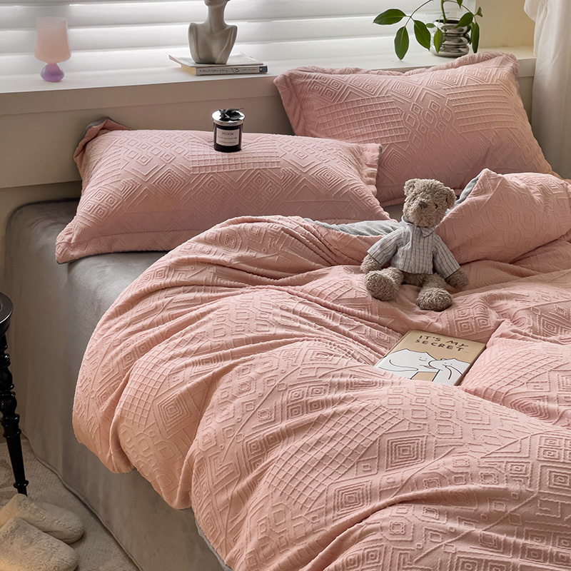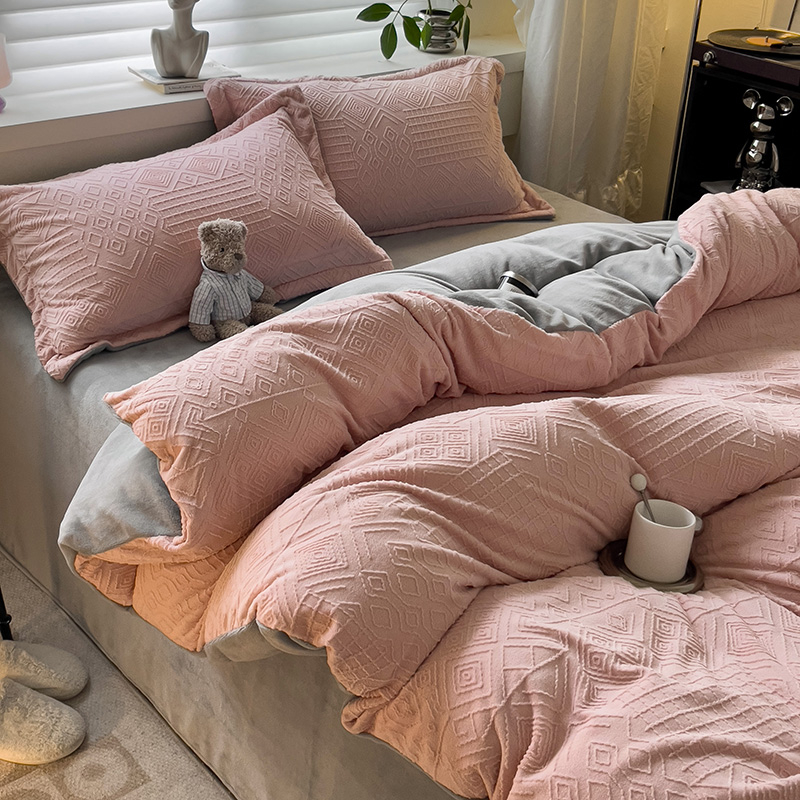 Lenjerie De Pat Cocolino 4 Piese Cu Cearceaf Pat Mare - Gri Si Roz In Relief