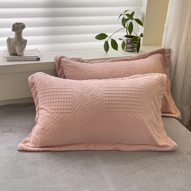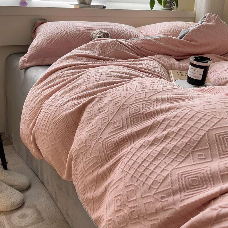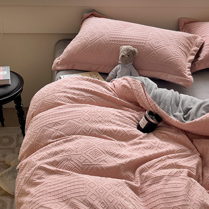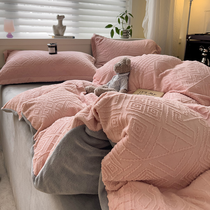 ☁️💖 Combinația elegantă de gri și roz, alături de textura în relief, creează o atmosferă relaxantă și plină de magie în dormitorul tău. Lenjeria Cocolino este extrem de moale, călduroasă și perfectă pentru nopți liniștite și un somn pufos, cu un design sofisticat ce încântă simțurile.
