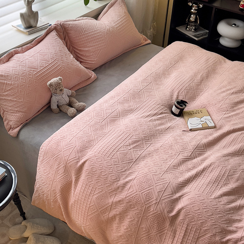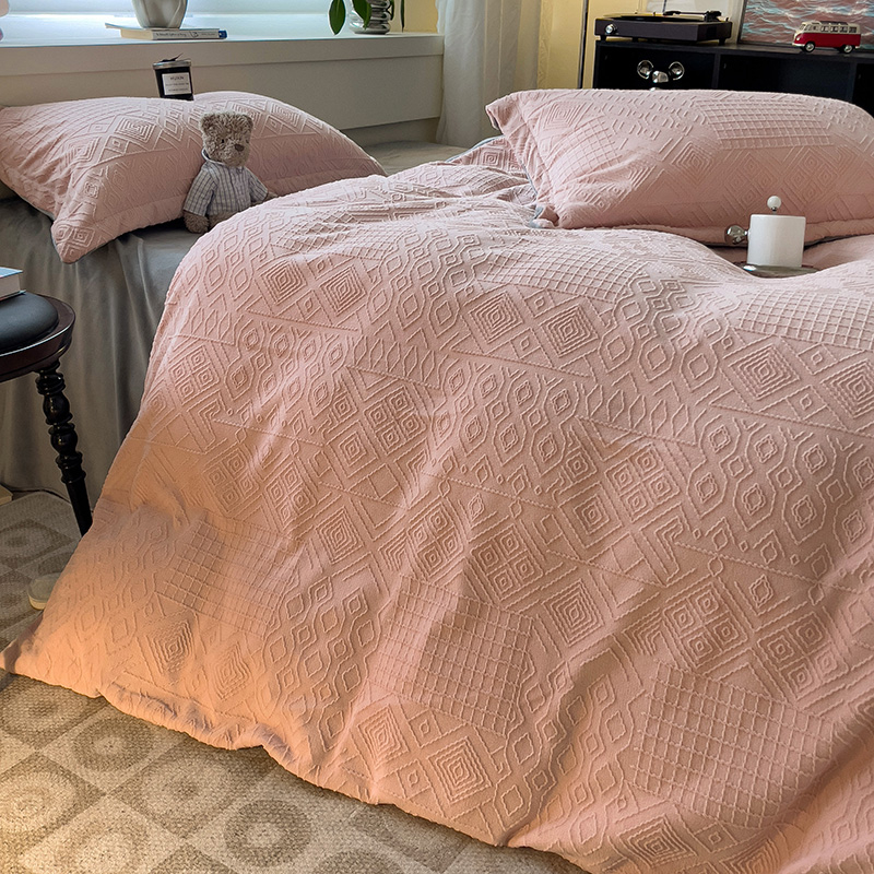 ➡️ Setul include cearceaf de pat generos, cearceaf de pilotă și două fețe de pernă. Designul modern cu detalii în relief și culori pastelate este ideal pentru dormitoarele contemporane sau pentru cei care iubesc decorurile cu suflet și stil.