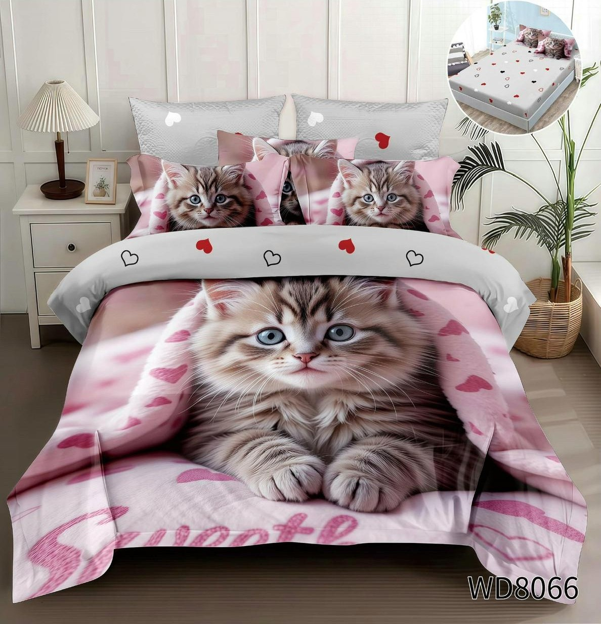 Lenjerie De Pat Finet 4 Piese Cu Elastic 5D In Relief - Gri Si Roz Cu Pisicuta