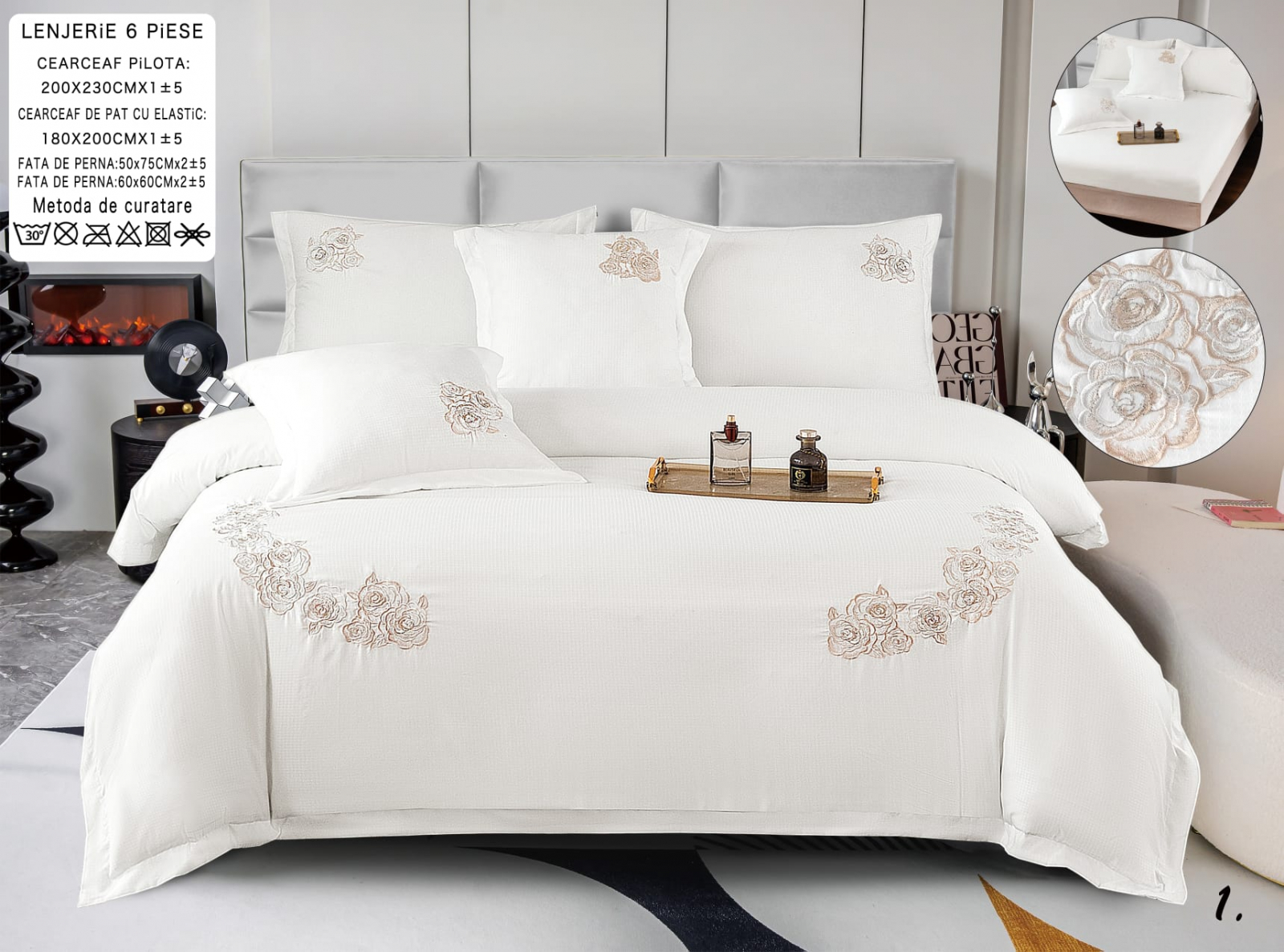 - 1 cearceaf de pat cu elastic potrivit pentru saltea de 180x200cm (fix) sau 160x200cm ( putin mai lejer)