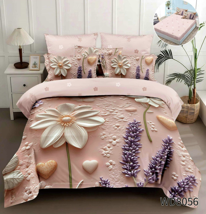 Lenjerie De Pat Finet 4 Piese Cu Elastic 5D In Relief - Roz Pudrat Cu Flori