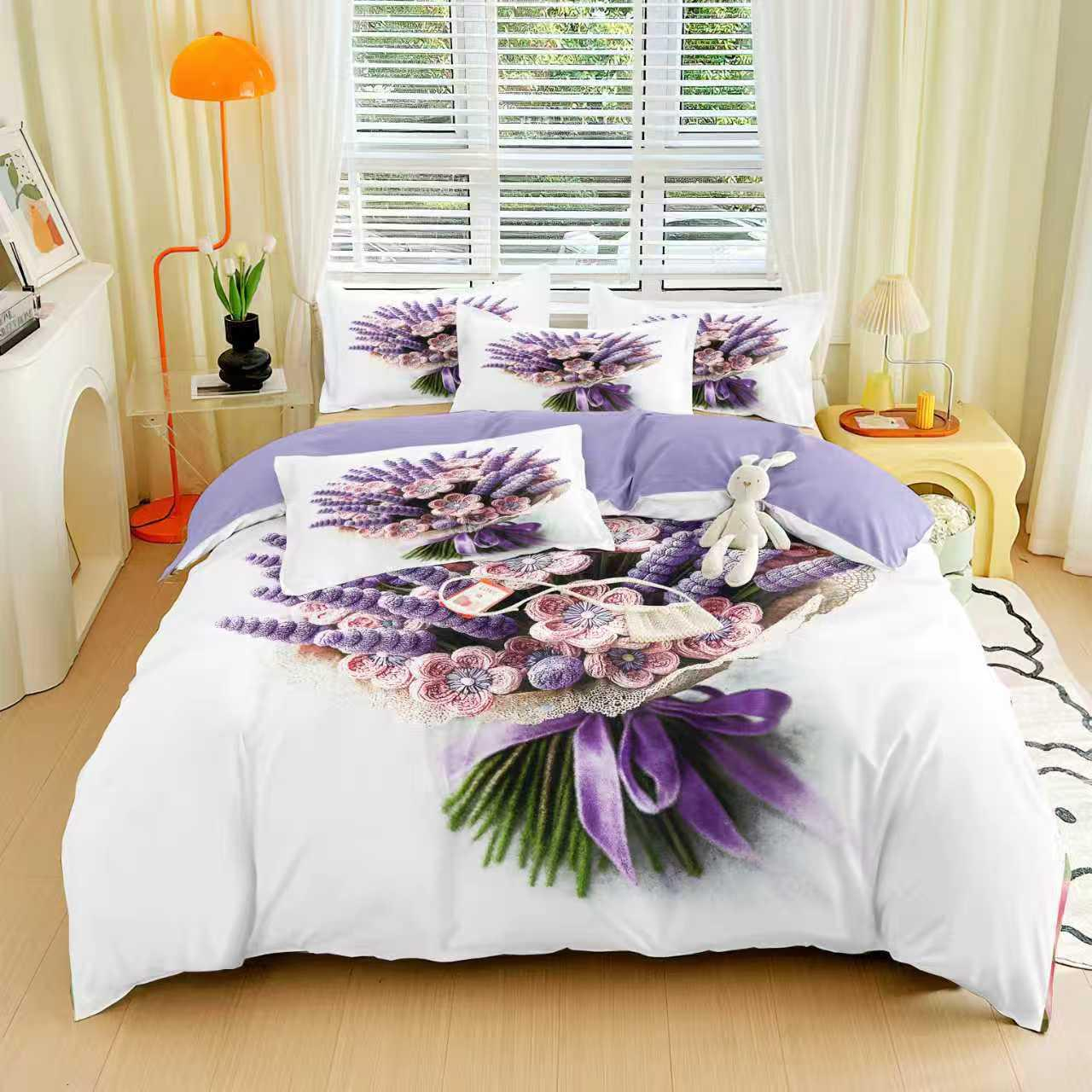 Lenjerie de Pat Finet 6 Piese cu Elastic 5D - Buchet De Flori Lila Crosetate