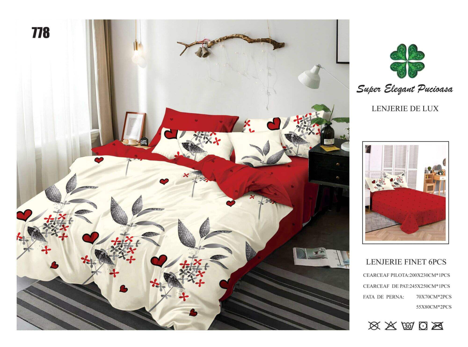 Lenjerii De Pat Din Finet 6 Piese - Inimioare Rosii Pe Fundal Alb