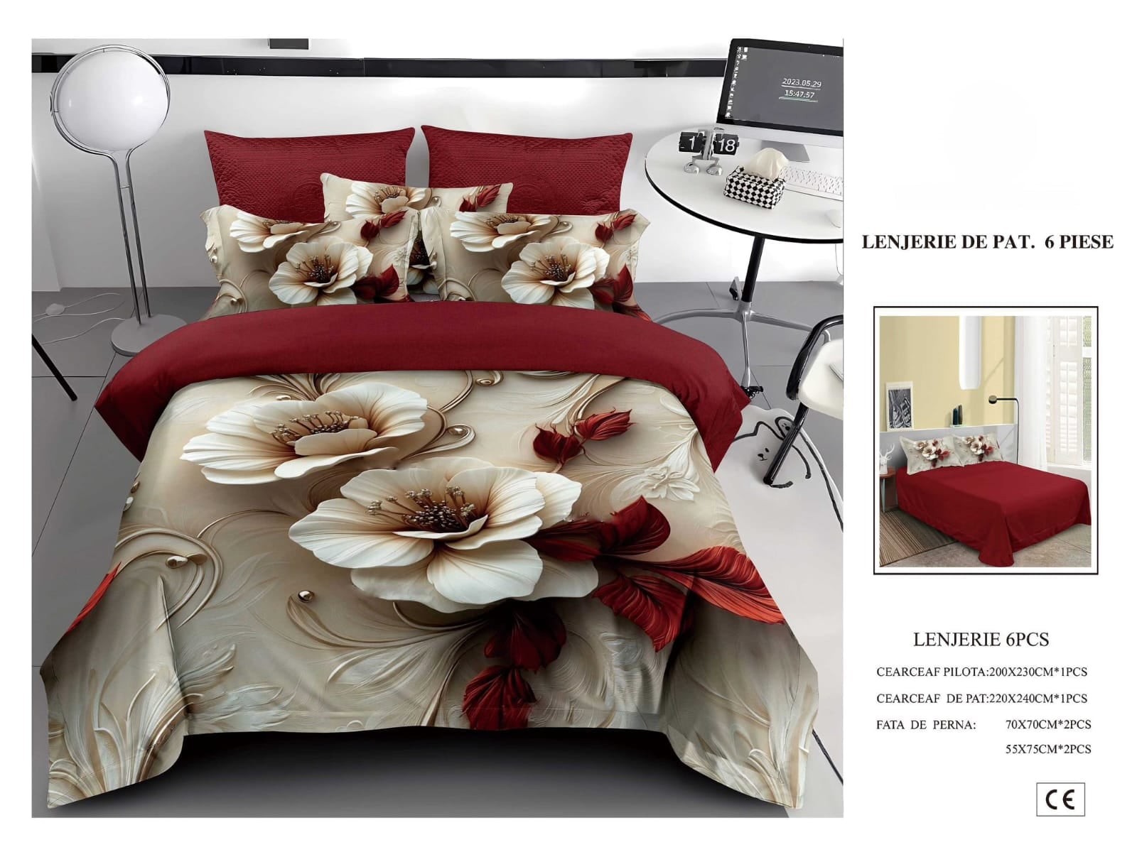 Lenjerie De Pat Finet 6 Piese 5D - Bordo Cu Flori De Portelan