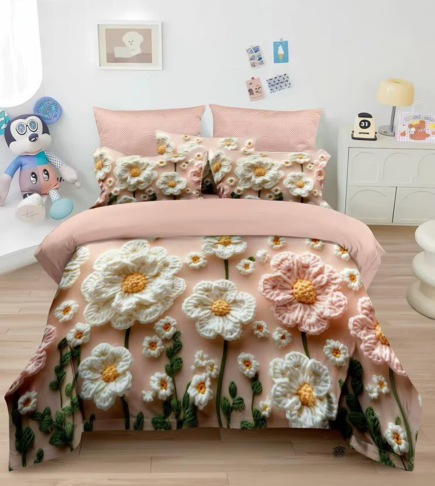 Cearceaful pentru pat si fetele de perna 70x70cm sunt UNI pe ambele parti.