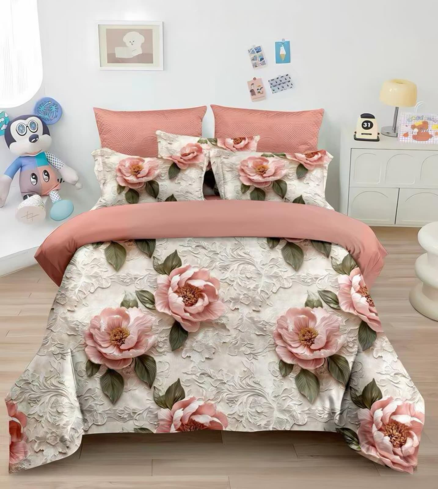 Lenjerie De Pat Finet 6 Piese 5D - Flori Roz Pudrat