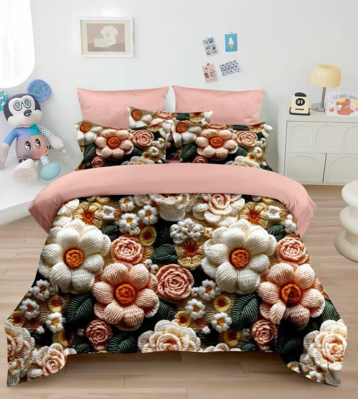 Cearceaful pentru pat si fetele de perna 70x70cm sunt UNI pe ambele parti.