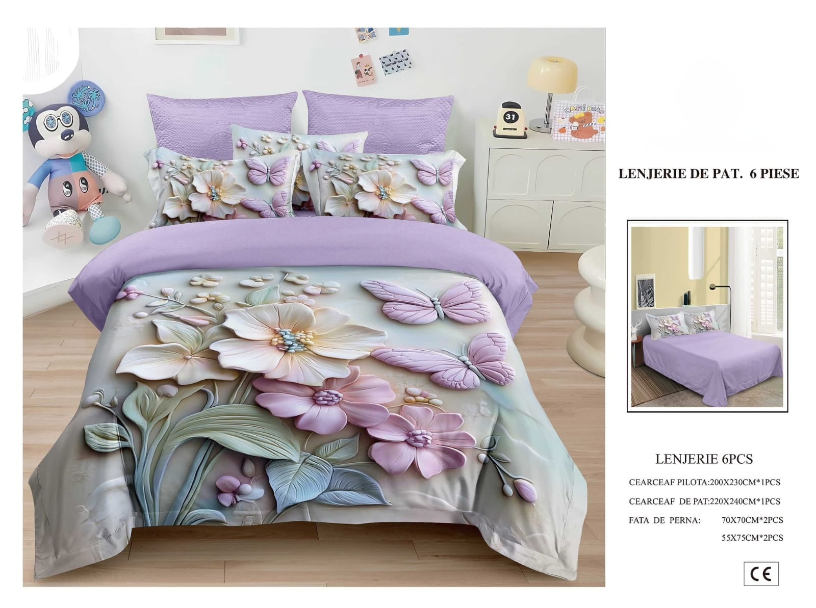 Lenjerie De Pat Finet 6 Piese 5D - Lila Cu Flori Si Fluturi