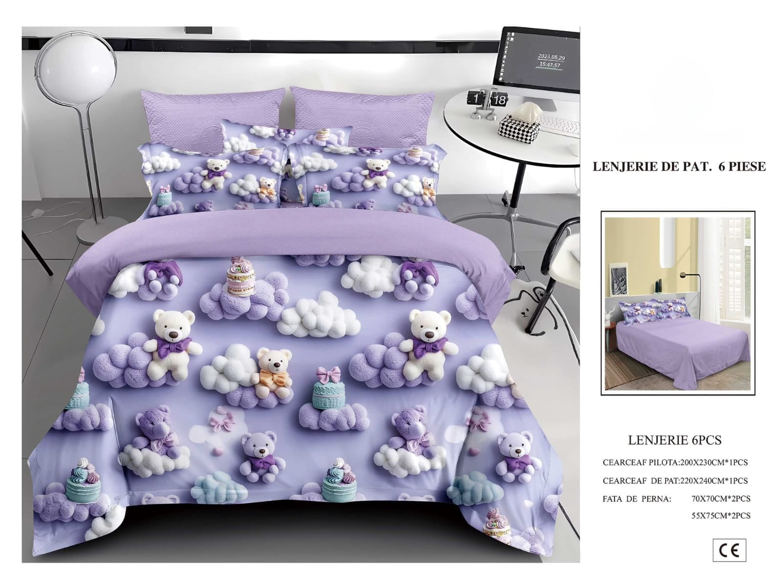 Lenjerie De Pat Finet 6 Piese 5D - Lila Cu Ursuleti Si Nori