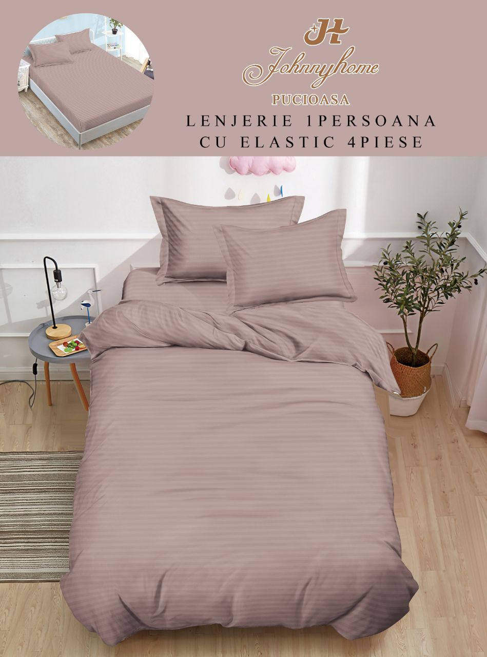 Lenjerie De Pat Din Damasc Finetat Cu Elastic 1 Persoana - Bej Pudrat