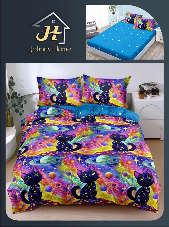 Lenjerie De Pat Bumbac Satinat Cu Elastic - Pisicute In Spatiu Colorat