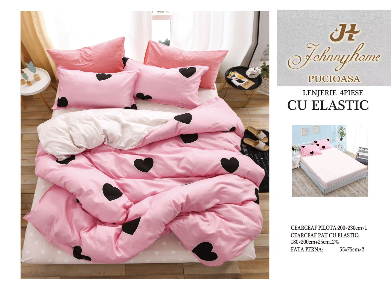 Lenjerie De Pat Bumbac Satinat Cu Elastic - Roz Cu Inimioare