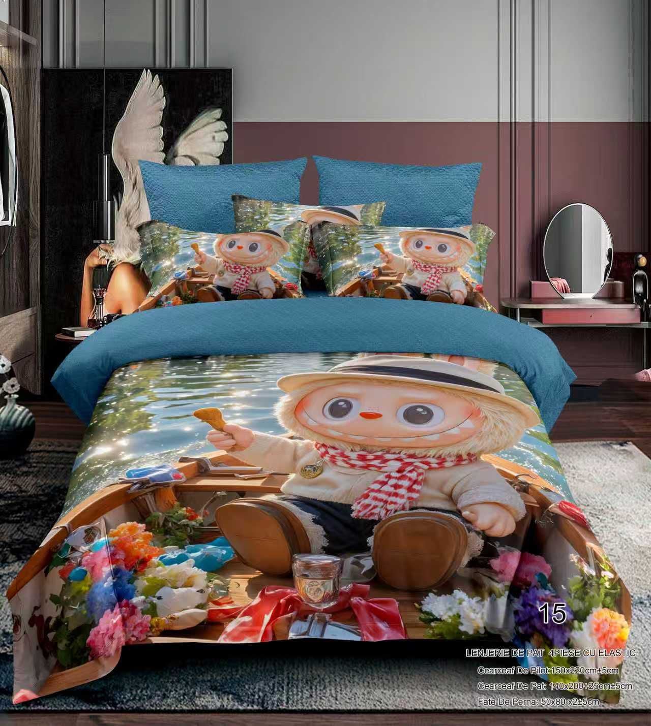 Lenjerie Din Bumbac Tip Finet Premium Pentru Copii Cu Elastic 1 Persoana - Labubu Pe Barca