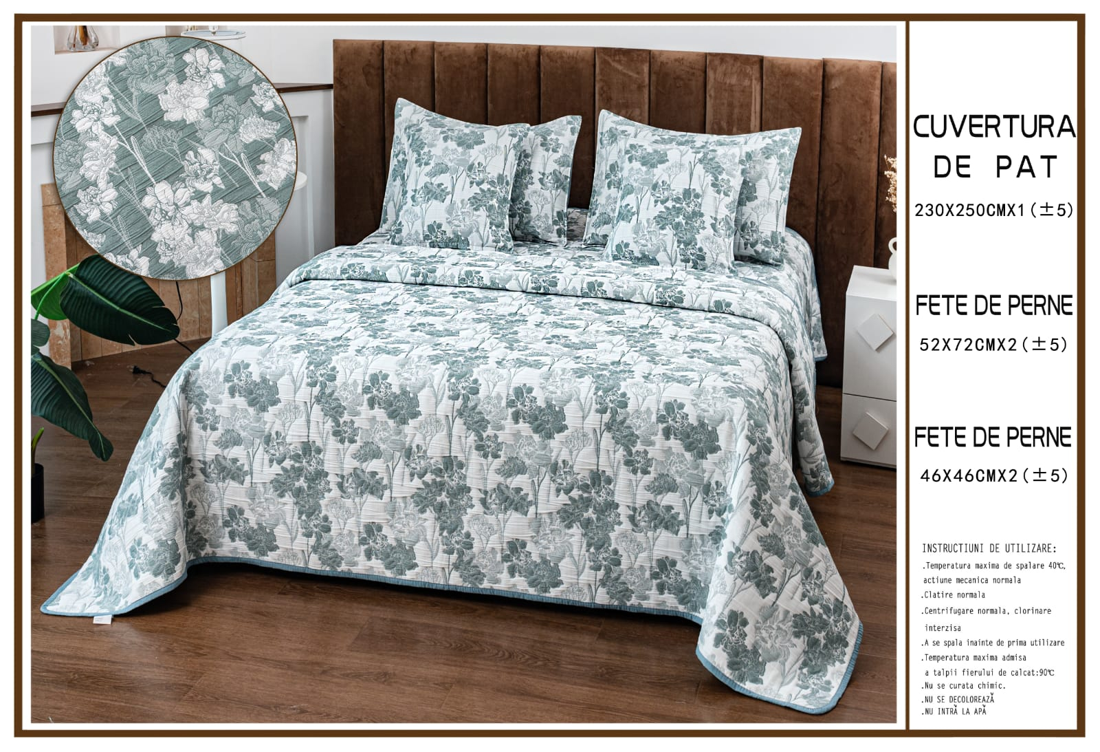 Cuvertura de pat este atent lucrată, avand cusaturi realizate la cele mai inalte standarde.