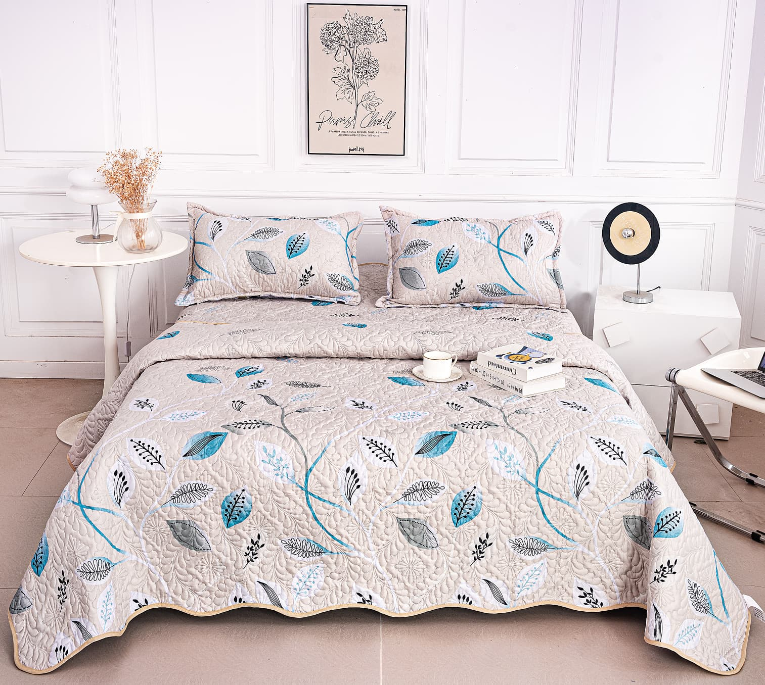 Cuvertura Din Bumbac Matlasat Cu Doua Fete - Bej Cu Frunze Pictate
