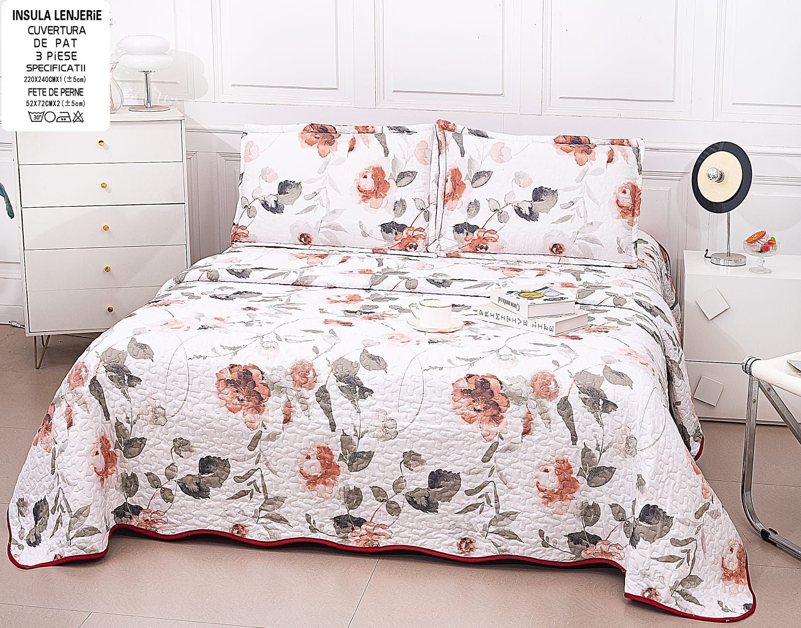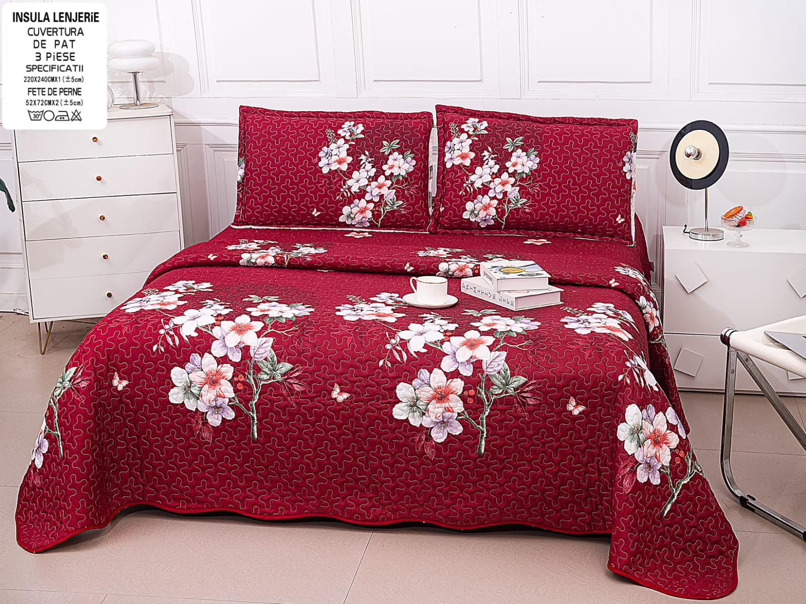 Cuvertura Din Bumbac Matlasat Cu Doua Fete - Bordo Cu Buchetele