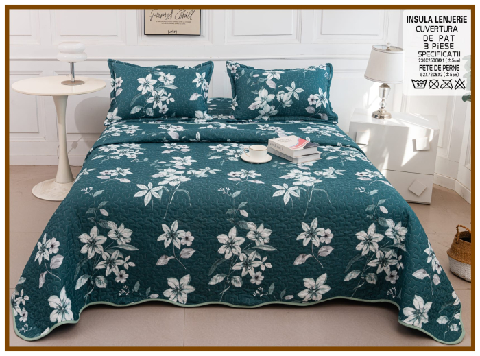 Te invitam sa alegi aceasta cuvertura din bumbac matlasat, iar dormitorul tau se va transforma intr-un mod inedit. Imprimeurile sunt atent alese, pentru ca tu sa te bucuri din plin de timpul petrecut in dormitor si pentru a adauga un plus de unicitate camerei tale. Materialul din bumbac matlasat este usor si placut la atingere, fiind potrivit pentru orice anotimp.