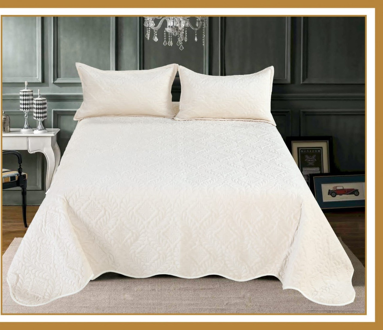 Cuvertura de pat are doua fete, pe o parte este din catifea, iar pe cealalta parte este din bumbac maltasat, este atent lucrata, avand cusaturi realizate la cele mai inalte standarde.