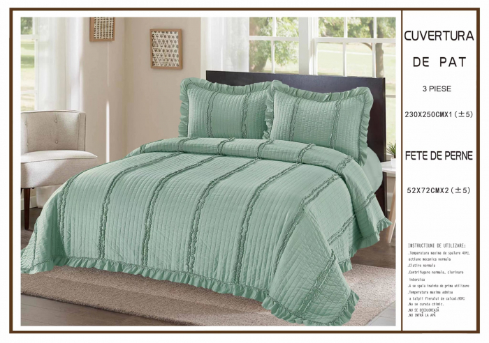 Cuvertura 3 Piese Uni Cu Volanas Bumbac Matlasat - Verde