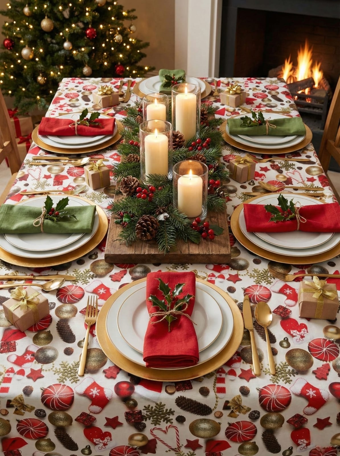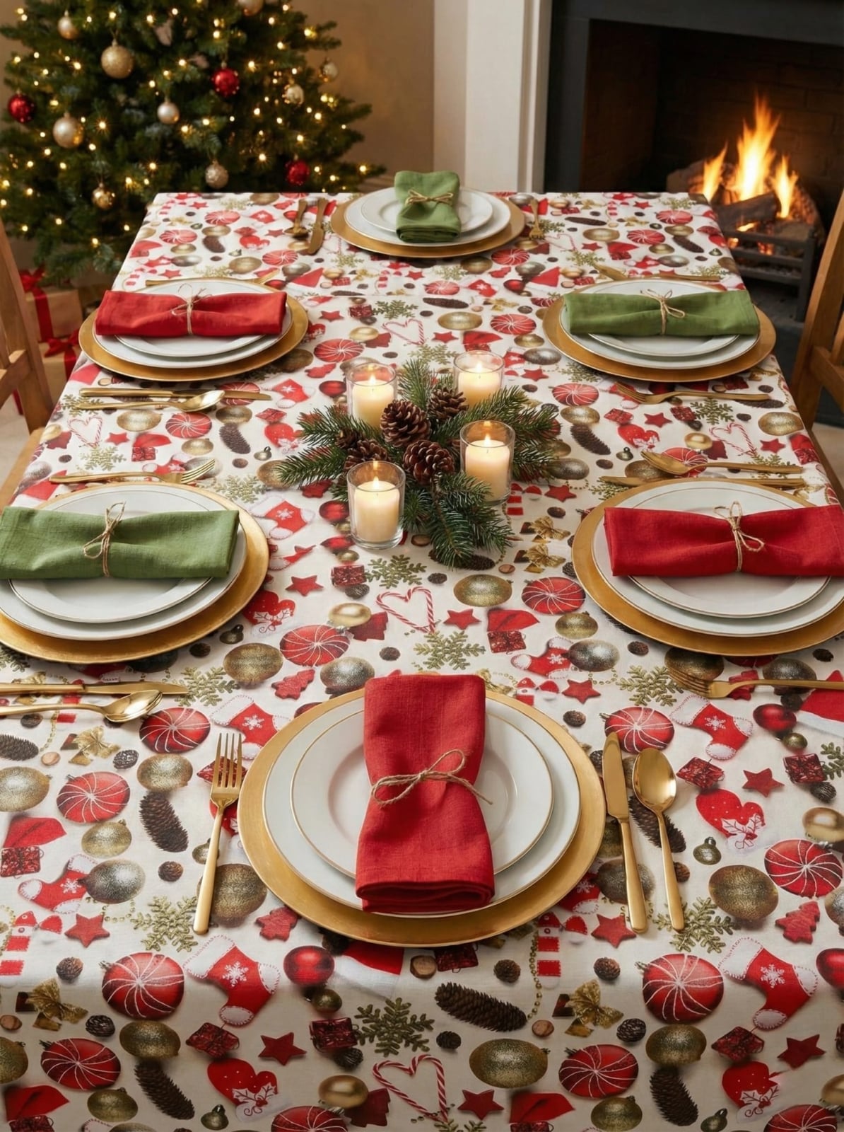Fata de masă cu motive de Crăciun, de calitate superioară, dintr-un material gros și dens, rezistent la folosiri îndelungate.