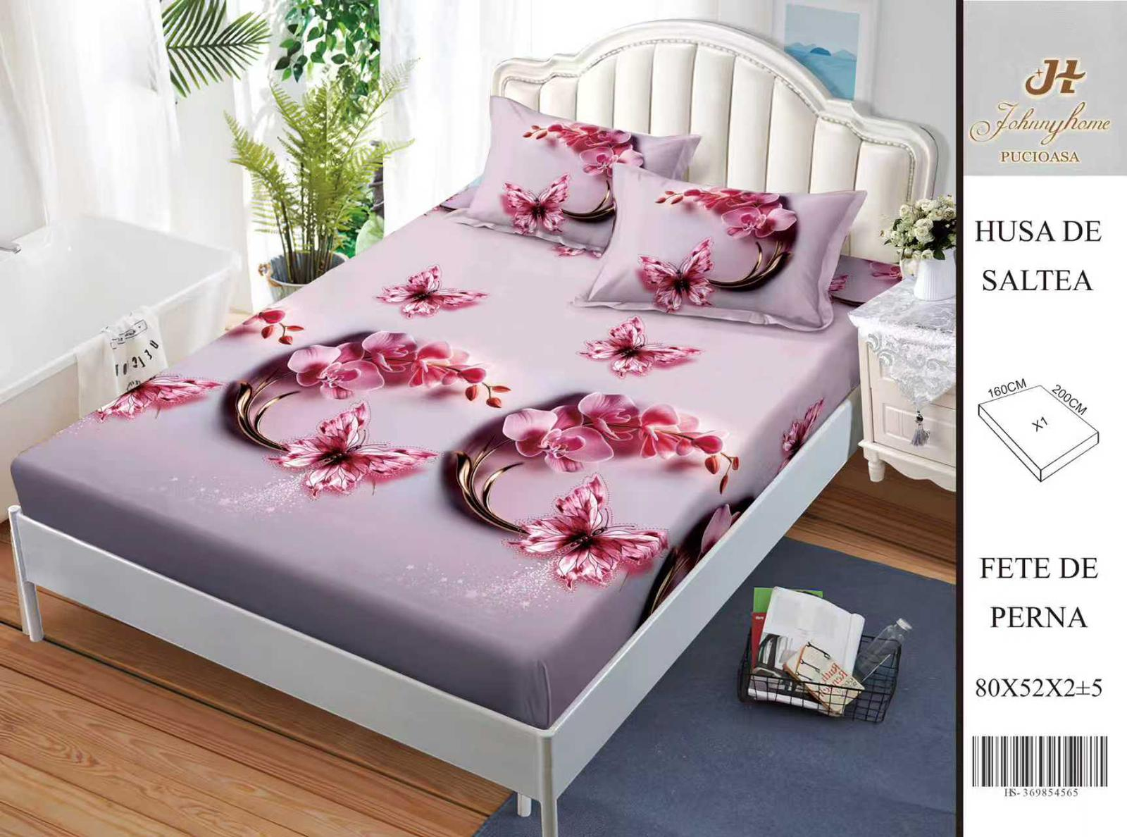 Husa Din Bumbac Satinat Cu Elastic Si Fete De Perna 160X200cm - Orhidee Si Fluturi