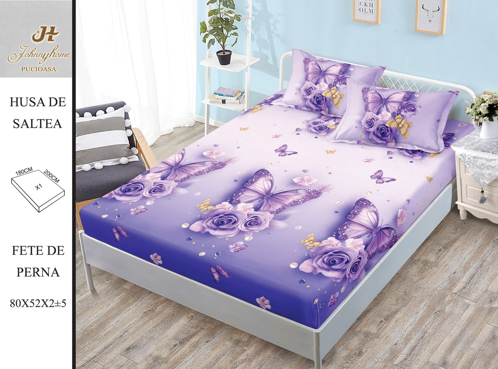 Husa Din Bumbac Satinat Cu Elastic Si Fete De Perna 180x200cm - Lila Cu Fluturasi Si Trandafiri
