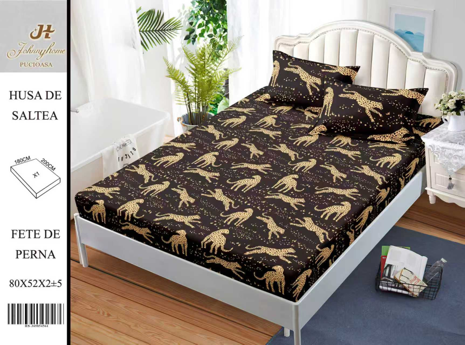 Husa Din Bumbac Satinat Cu Elastic Si Fete De Perna 180X200cm - Negru Cu Leoparzi