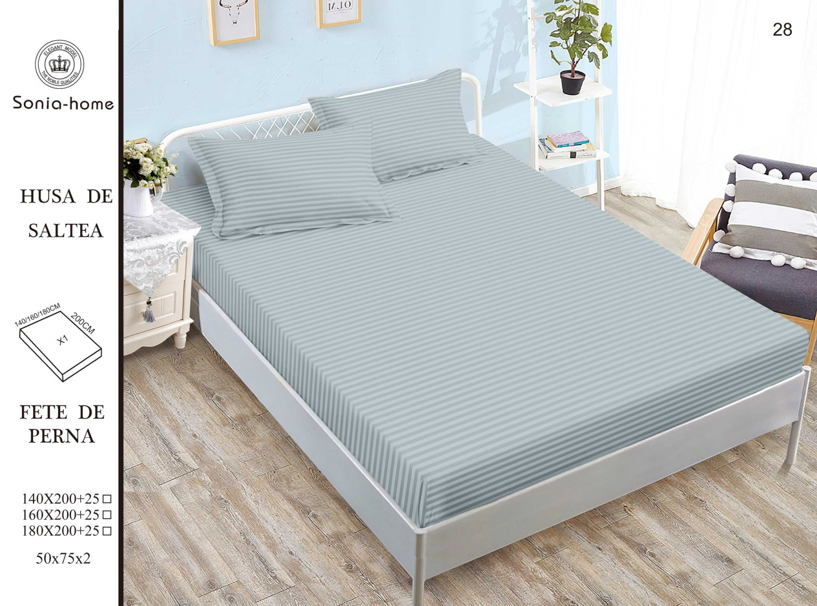 - cearceaf cu elastic potrivit pentru saltea de 160x200x25cm(perfect intins) sau 140x200x25cm(mai lejer) - doua fete de perna 55x80cm