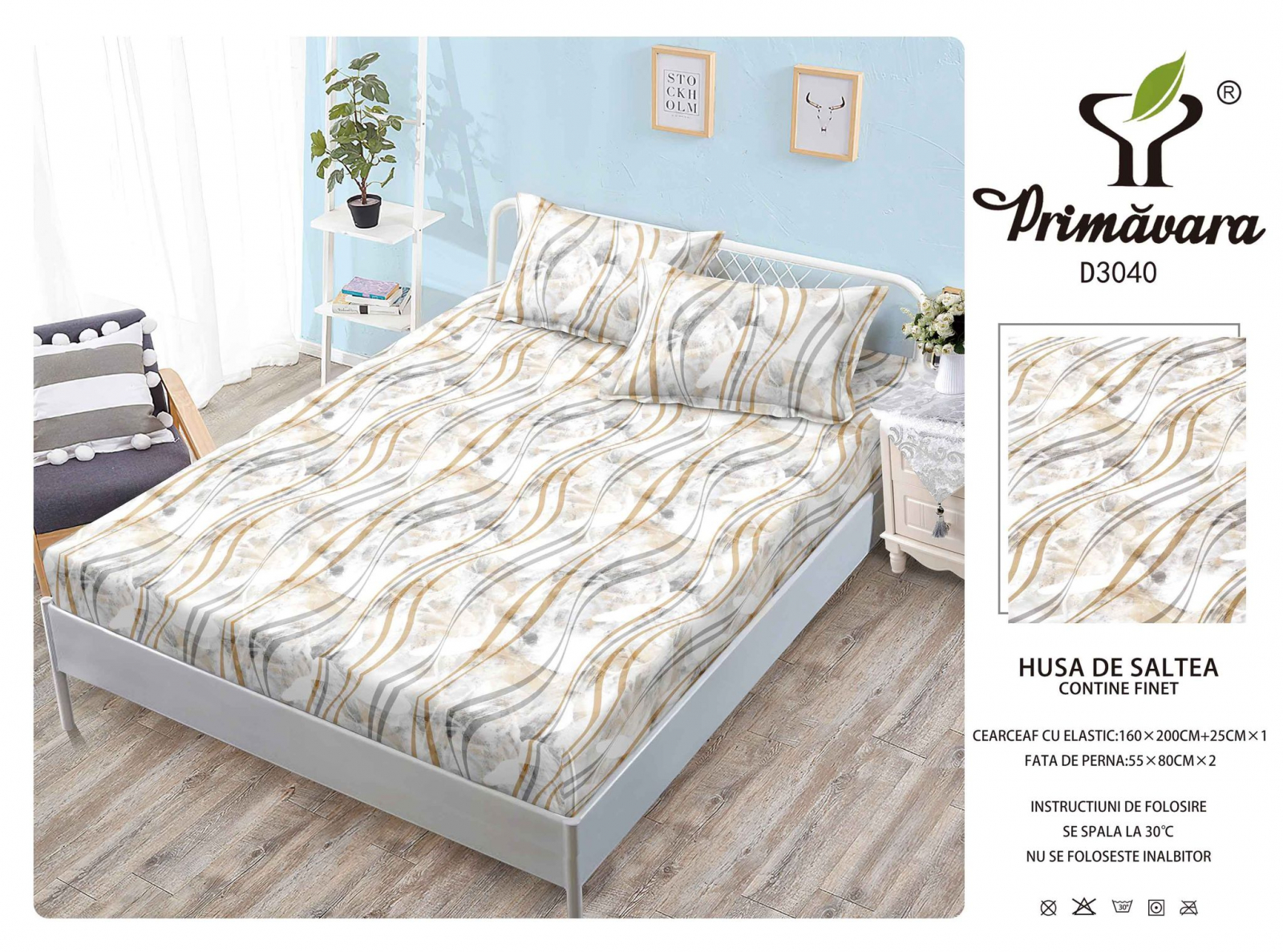 Husa de protectie cu elastic pentru saltea, confectionata din bumbac tip finet, ideala atat pentru protectia saltelei, cat si pentru a fi folosita ca cearceaf de pat. Material potrivit pentru pentru orice sezon, permitand pielii sa respire datorita texturii bumbacului. Aceasta vine insotita de doua fete de perna, alcatuind un set potrivit pentru orice tip de pat.Culori rezistente la spalat, care nu se decoloreaza in timp, non-alergice.