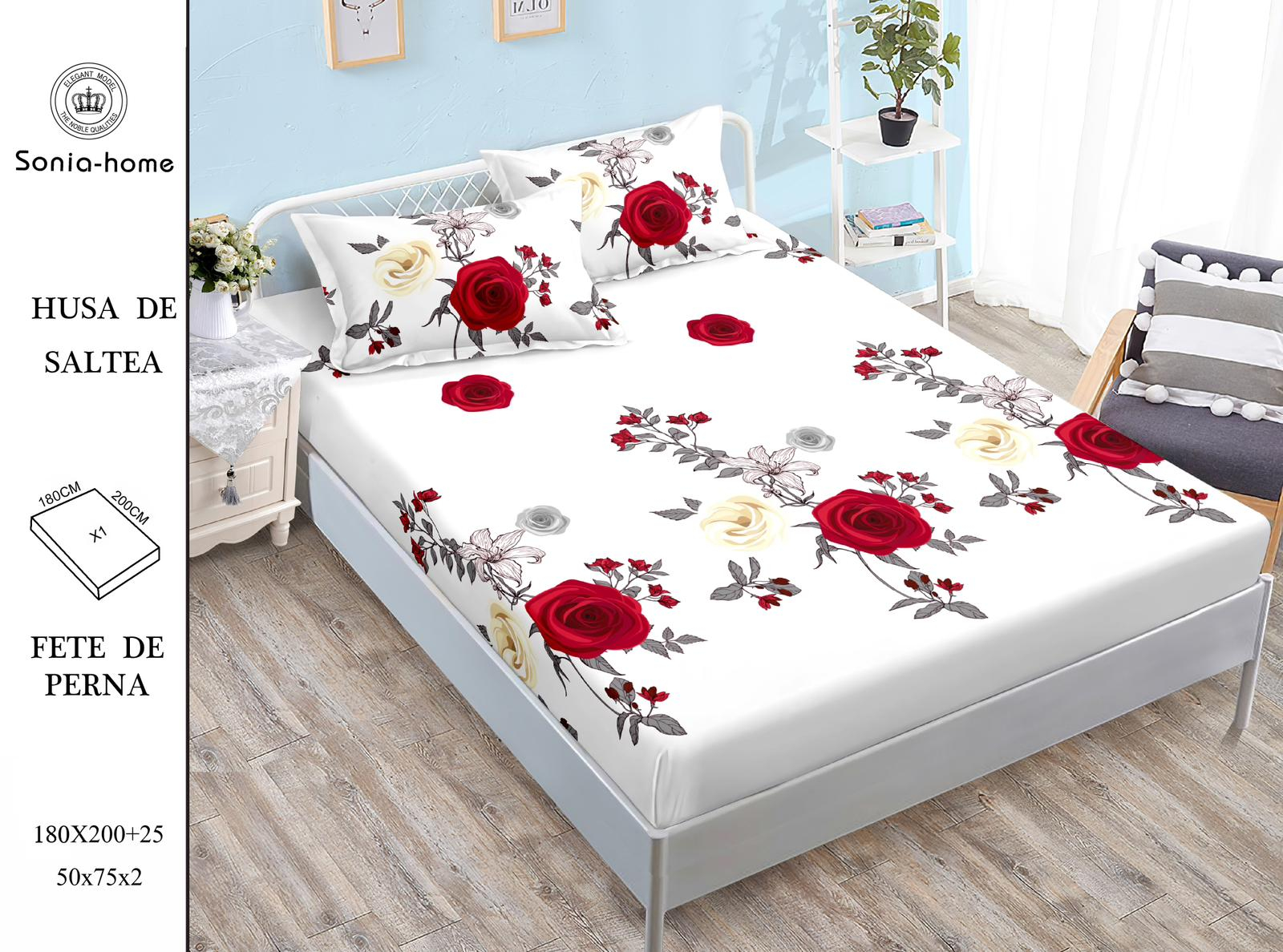 Husa de protectie cu elastic pentru saltea, confectionata din bumbac tip finet, ideala atat pentru protectia saltelei, cat si pentru a fi folosita ca cearceaf de pat. Material potrivit pentru pentru orice sezon, permitand pielii sa respire datorita texturii bumbacului. Aceasta vine insotita de doua fete de perna, alcatuind un set potrivit pentru orice tip de pat.