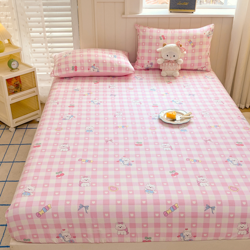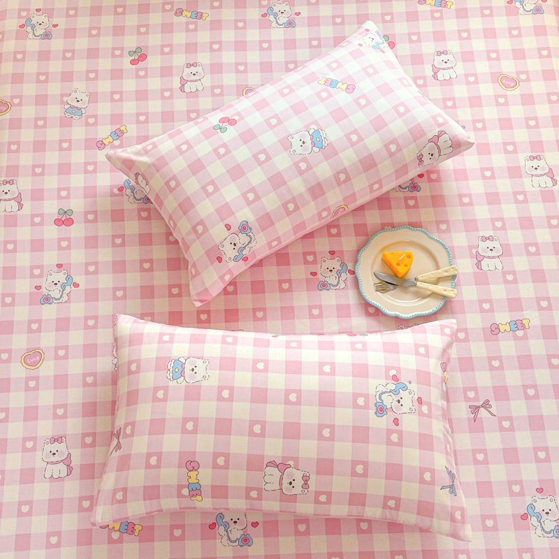 Husa Din Bumbac 100% Ranforce Cu Elastic Si Fete De Perna 160x200cm - Catelusi, Inimioare si Fundite Roz
