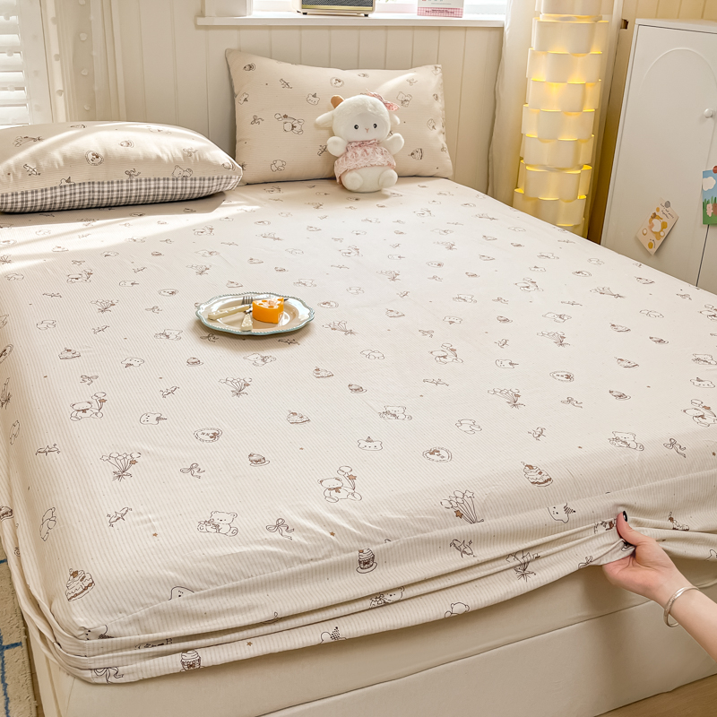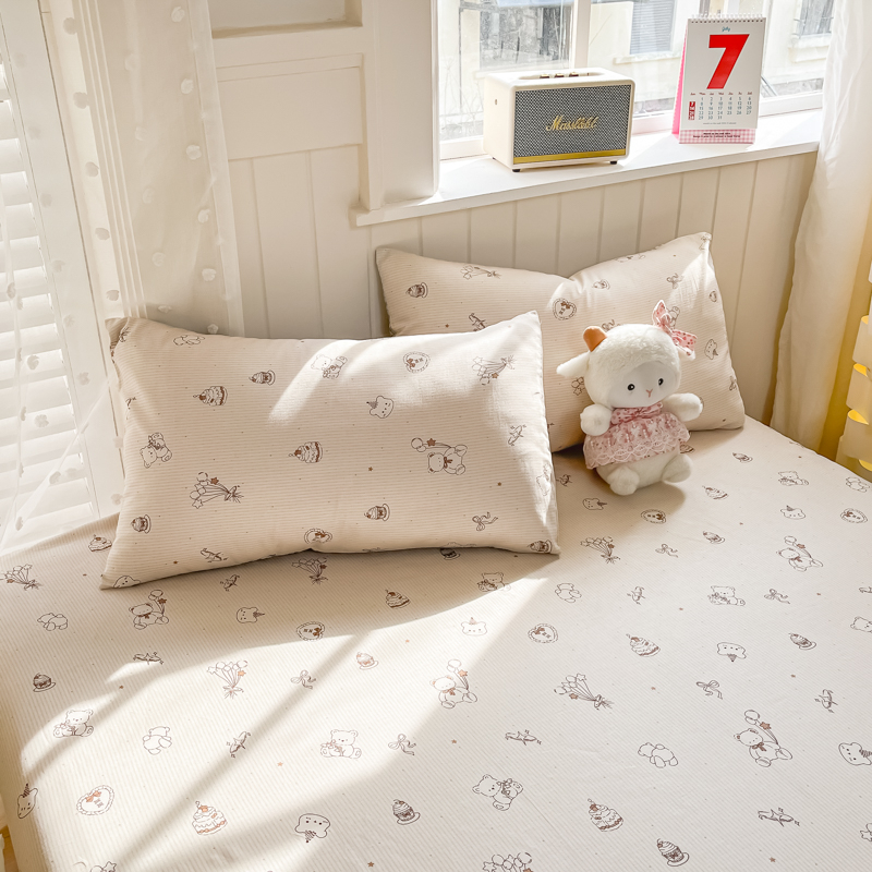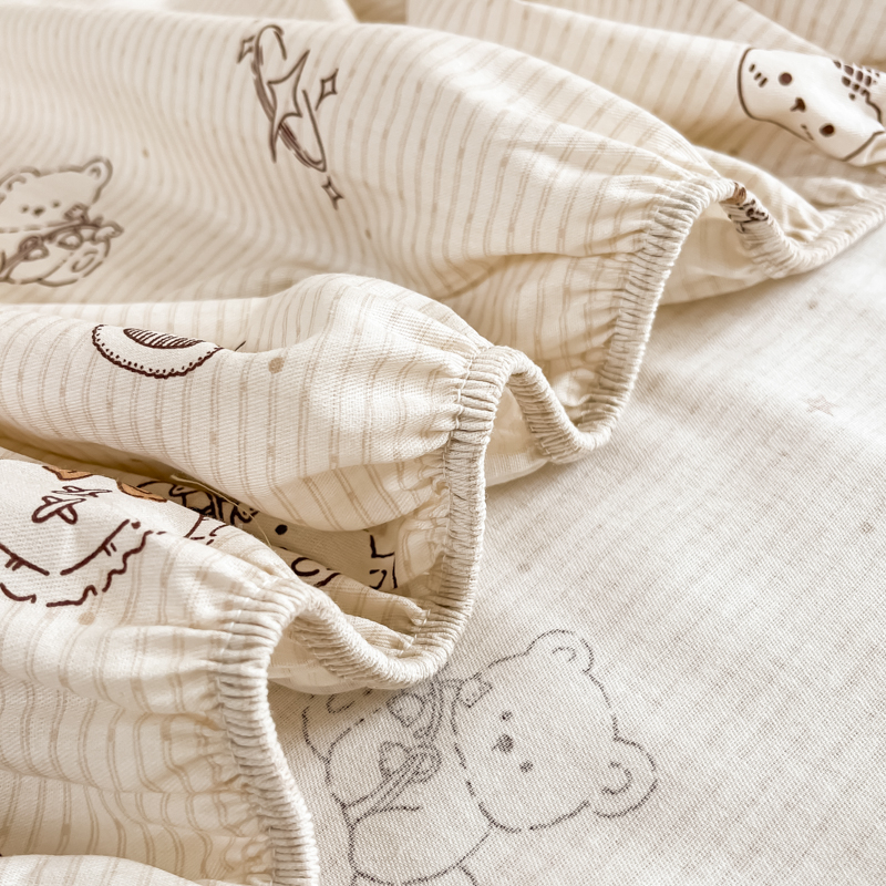 Husa Din Bumbac 100% Ranforce Cu Elastic Si Fete De Perna 160x200cm - Crem Cu Ursuleti