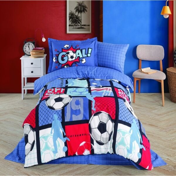 Lenjerie De Pat Bumbac 100% Poplin 1 Persoana - Albastru Cu Minge Pe Teren De Fotbal