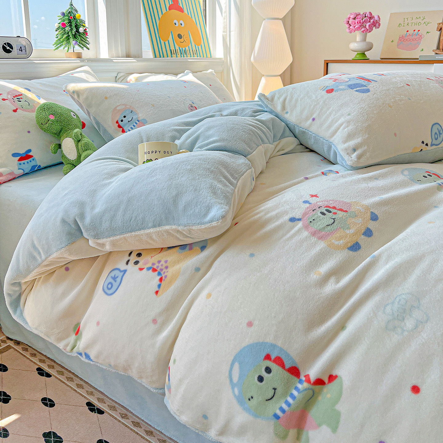 • Lenjeria are două fețe, conform imaginii de prezentare - o parte bleu UNI si una cu imprimeu cu dinozauri;