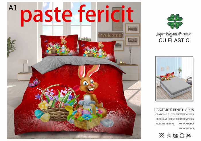 Lenjeria de pat are doua fete, pe o parte un imprimeu, pe cealalta alt imprimeu, astfel ca poti de fiecare data sa schimbi decorul camerei.