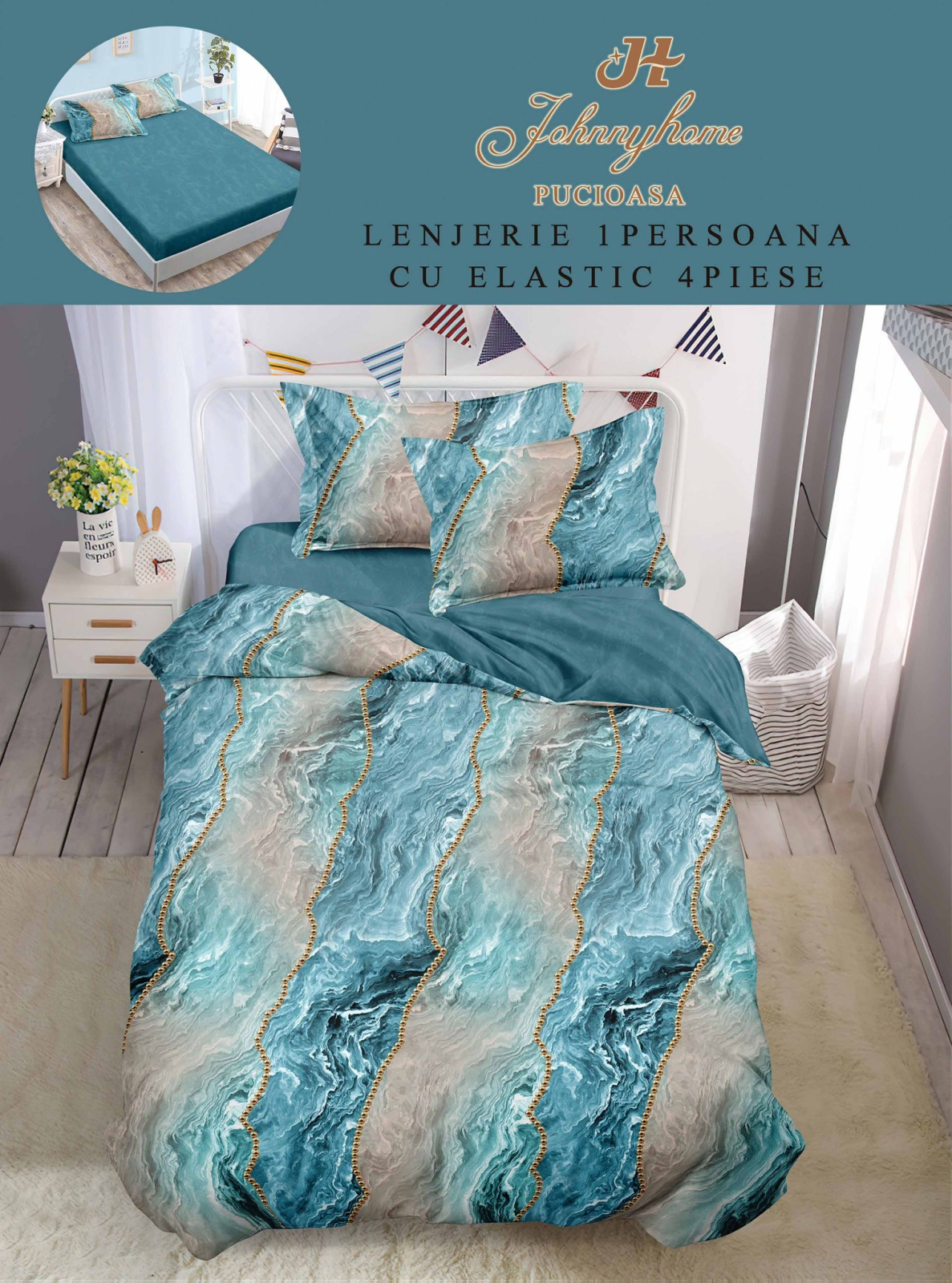 Lenjerie De Pat Finet Cu Elastic 1 Persoana - Marmura Turcoaz