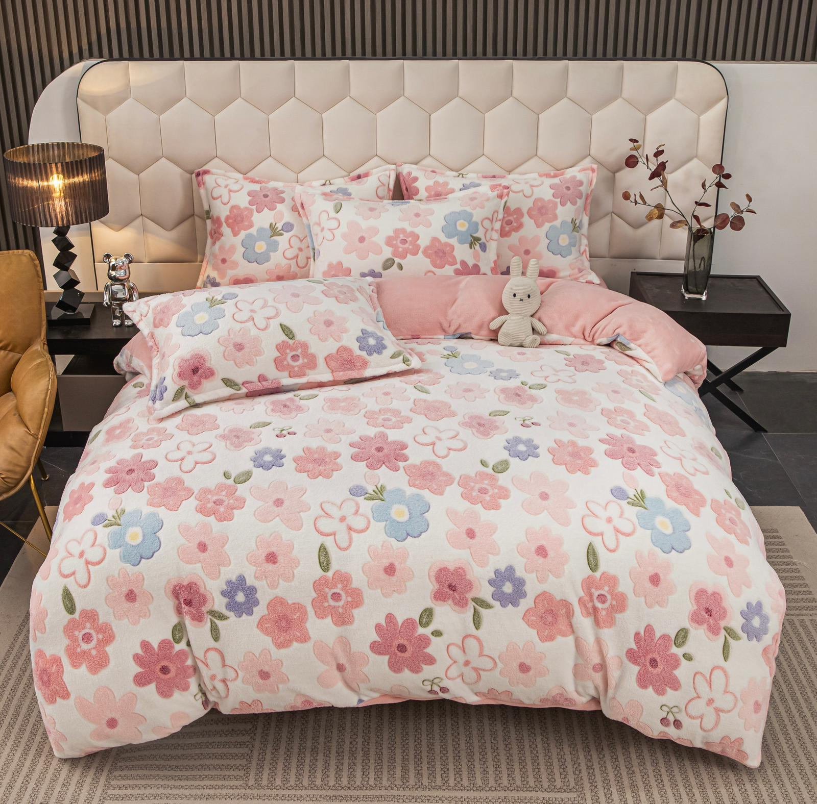 Lenjerie De Pat Cocolino 4 Piese Cu Elastic - Roz Cu Floricele