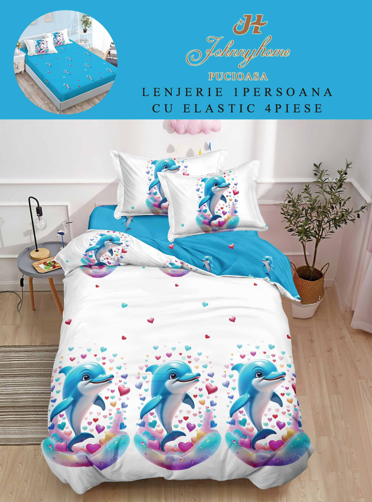 Lenjerie De Pat Finet Cu Elastic 1 Persoana - Delfini Si Inimiare Colorate