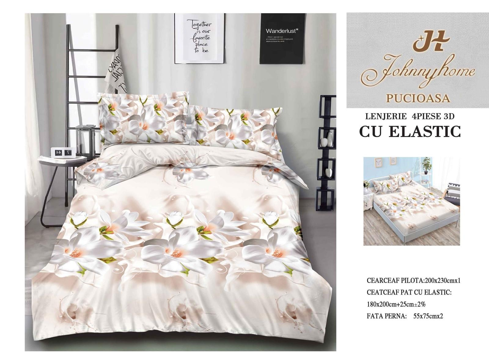 Lenjerie De Pat Bumbac Satinat 3D Cu Elastic - Flori Albe