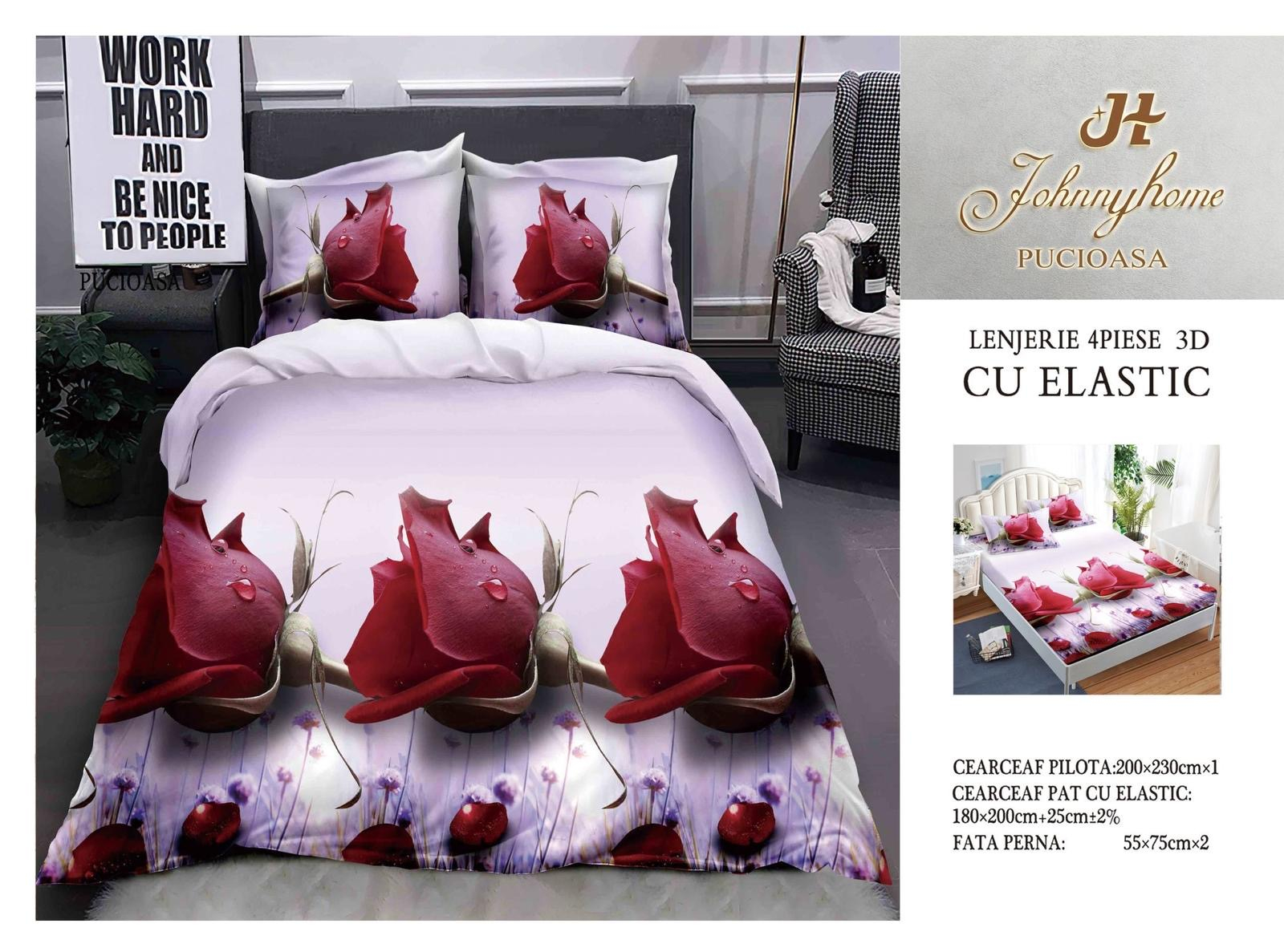 Lenjerie De Pat Bumbac Satinat 3D Cu Elastic - Trandafir Rosu