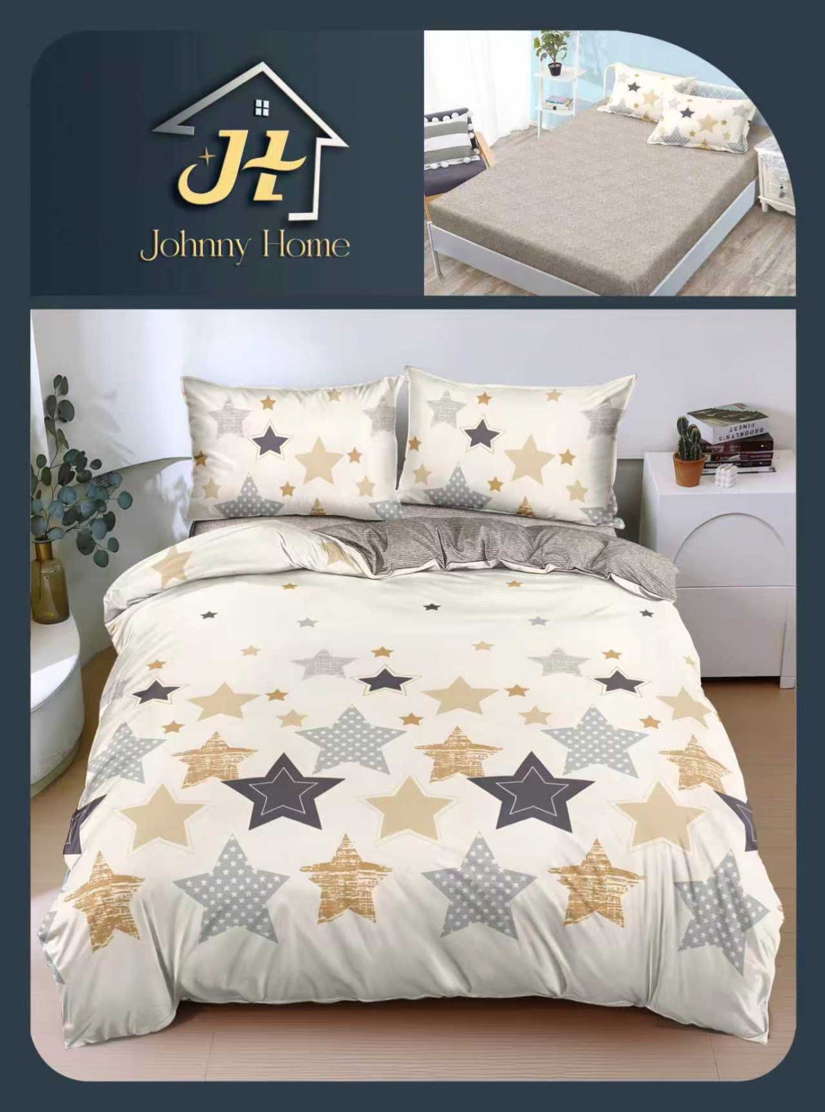 Lenjerie De Pat Bumbac Satinat Cu Elastic - Alb Cu Stele Abstracte