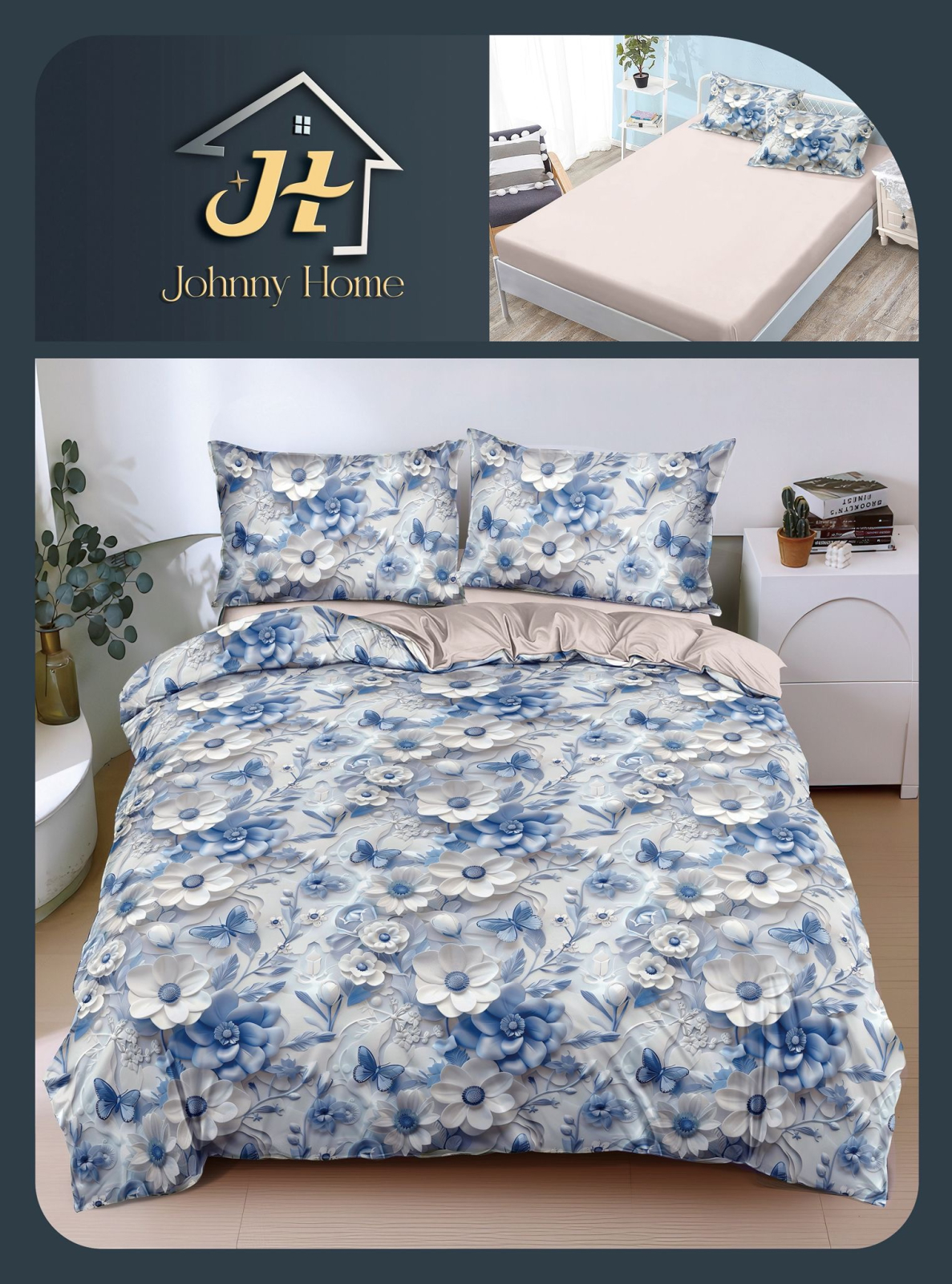 Lenjerie De Pat Bumbac Satinat Cu Elastic - Baby Blue Cu Flori