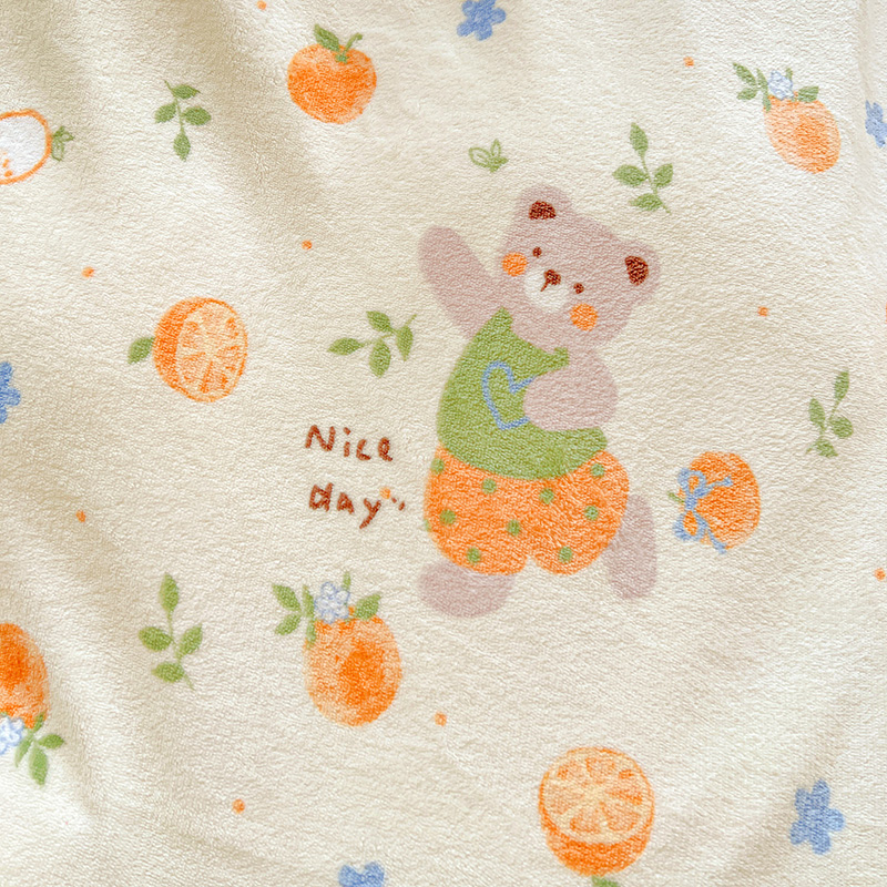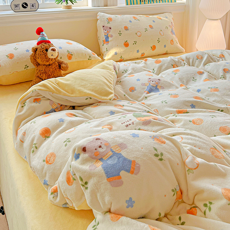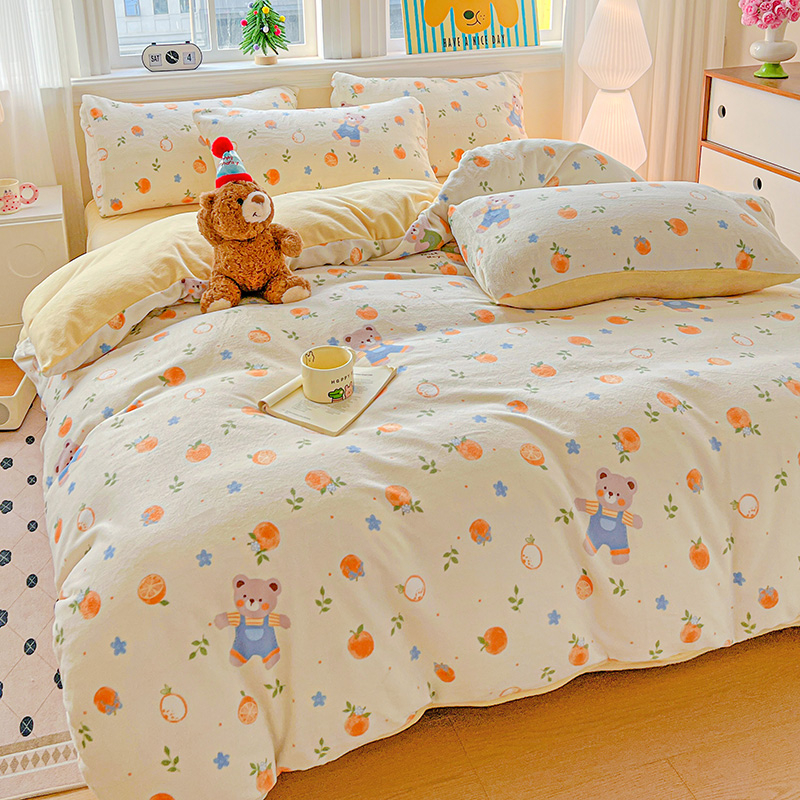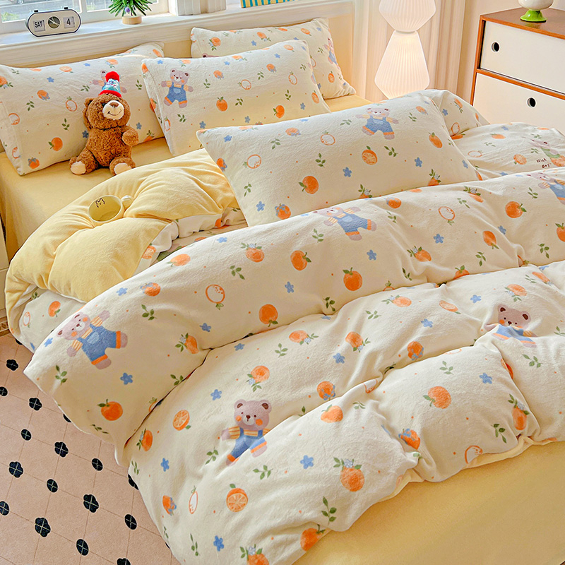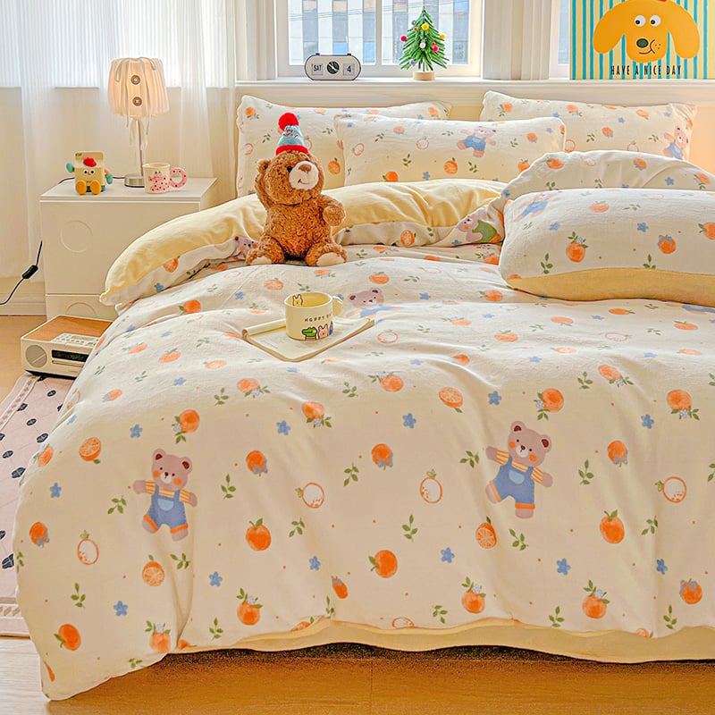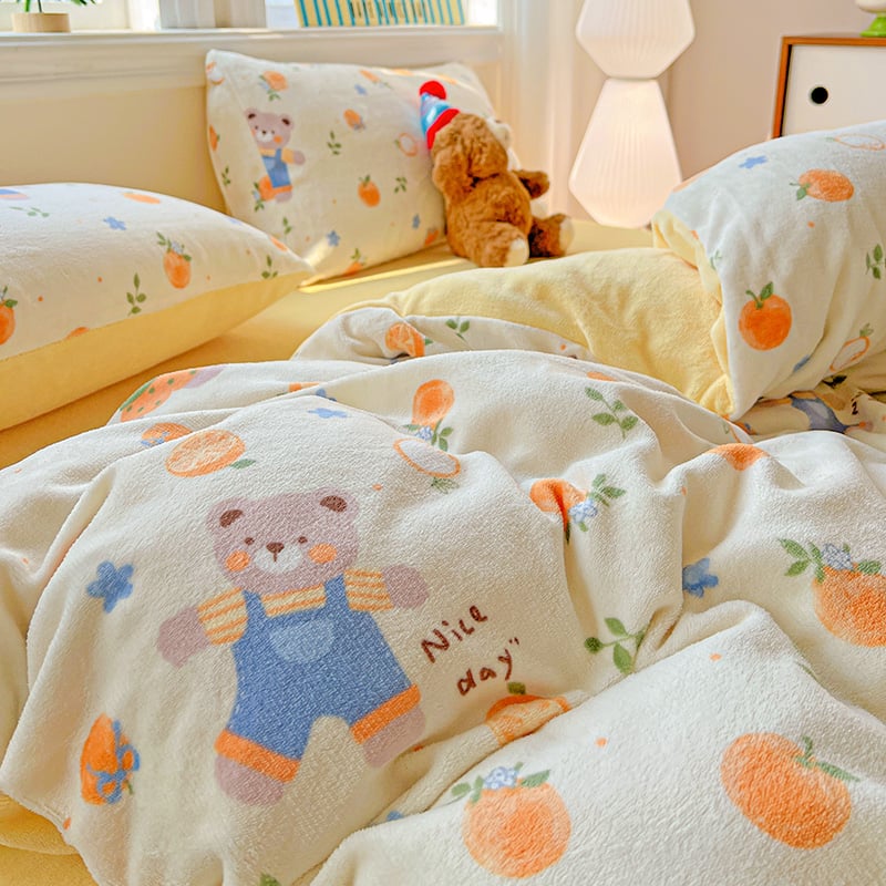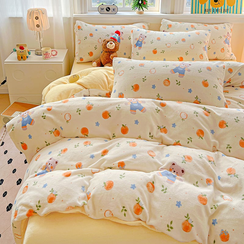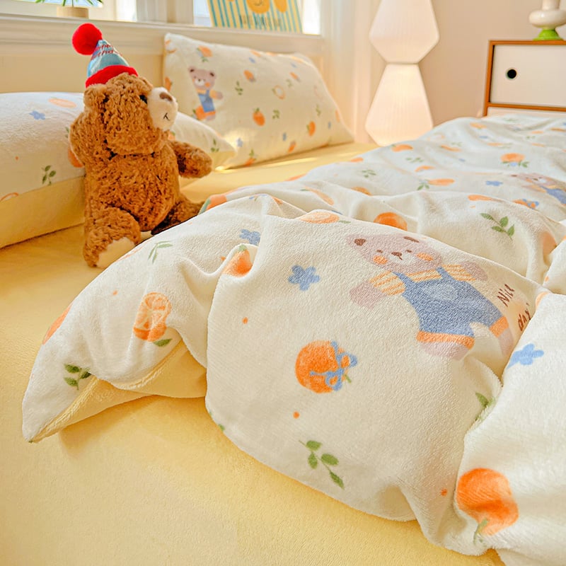 🧡 Adaugă un strop de veselie și căldură în dormitorul tău cu această lenjerie Cocolino cu imprimeu cu ursuleți, portocale si floricele. Realizată din microfibră plușată, moale și călduroasă, este alegerea perfectă pentru nopțile friguroase.