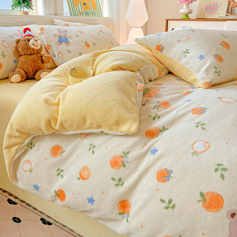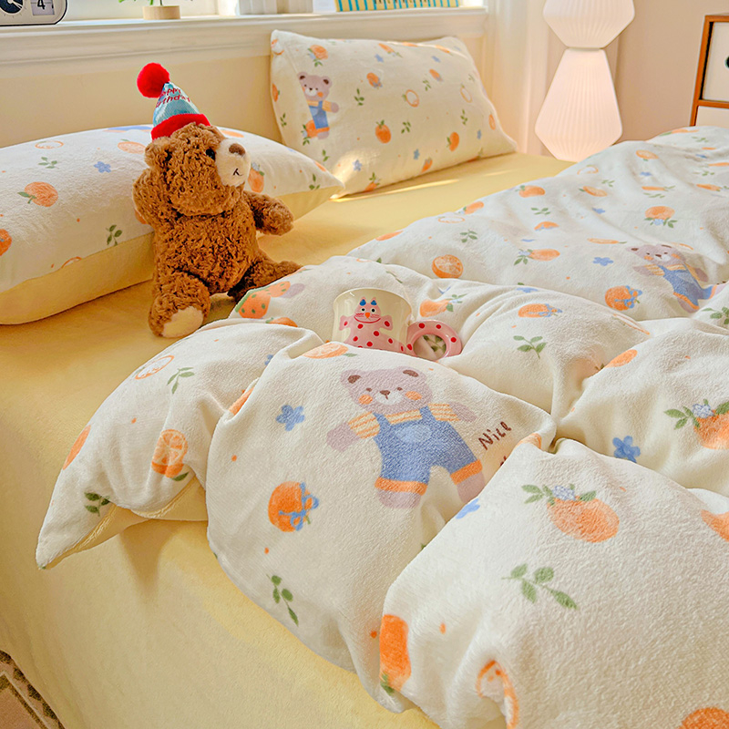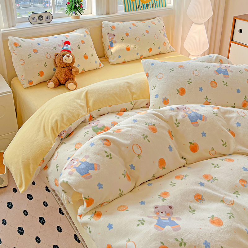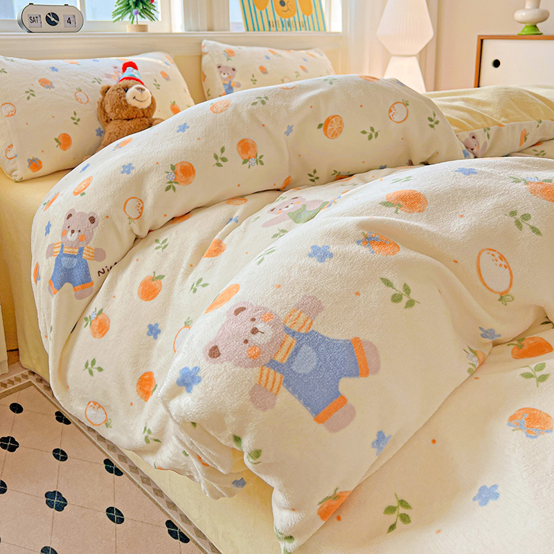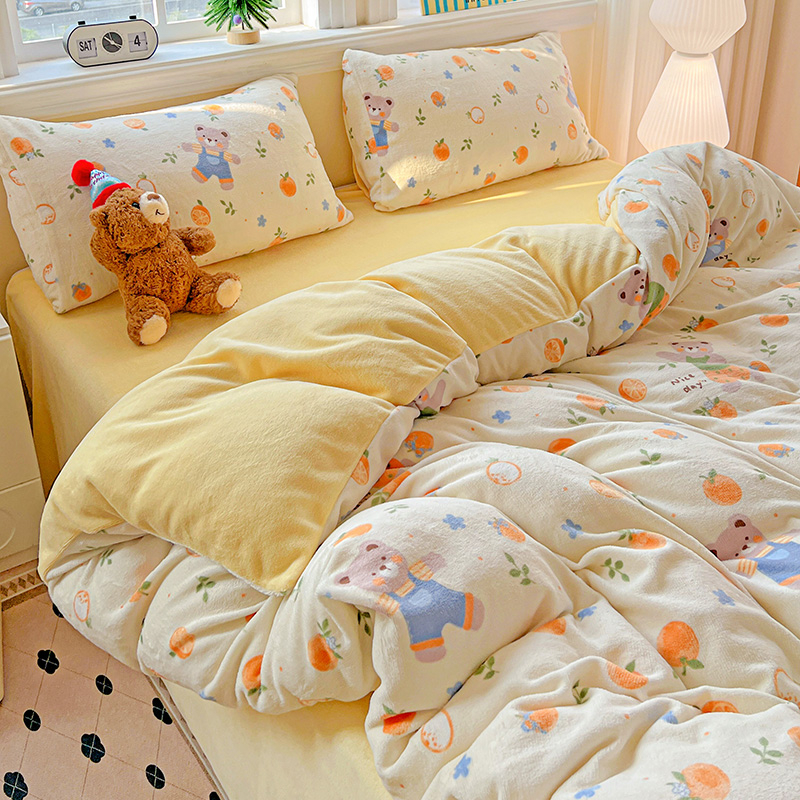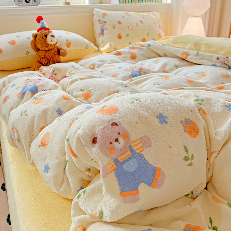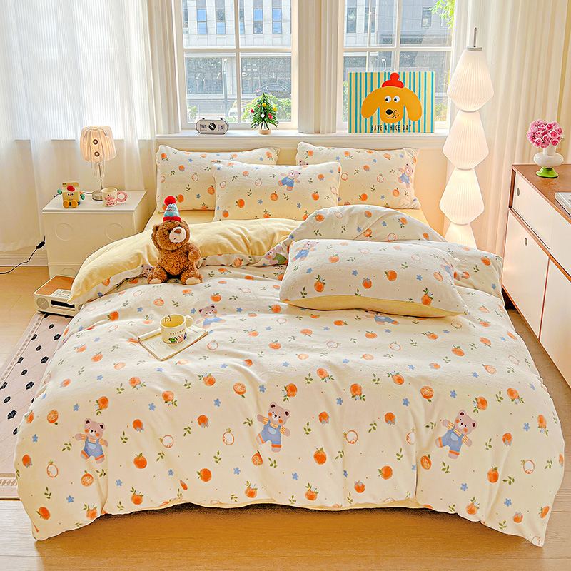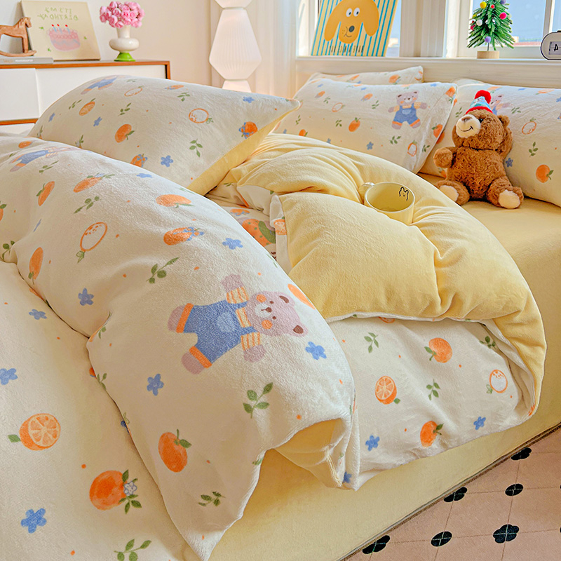 🧡 Adaugă un strop de veselie și căldură în dormitorul tău cu această lenjerie Cocolino cu imprimeu cu ursuleți, portocale si floricele. Realizată din microfibră plușată, moale și călduroasă, este alegerea perfectă pentru nopțile friguroase.