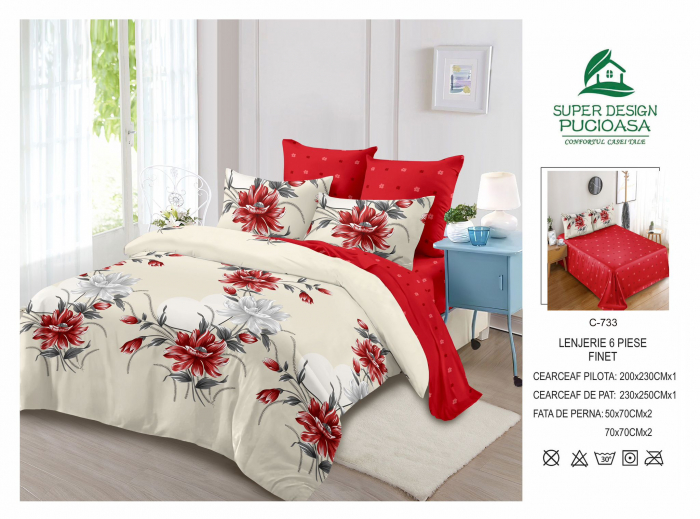 Materialul din Bumbac Tip Finet este moale si placut la atingere, fiind potrivit pentru orice anotimp. Imprimeurile sunt atent alese, pentru ca tu sa te bucuri din plin de timpul petrecut in dormitor.