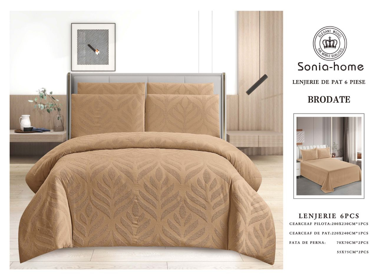 Lenjerie De Pat Din Finet Superior Cu Imprimeu Brodat In Relief - Maro Cu Frunze