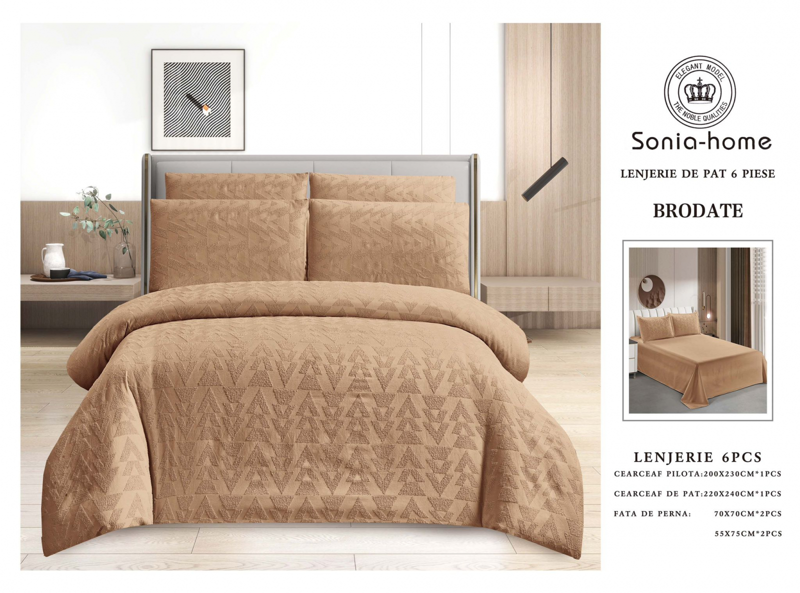 Lenjerie De Pat Din Finet Superior Cu Imprimeu Brodat In Relief - Maro Cu Triunghiuri