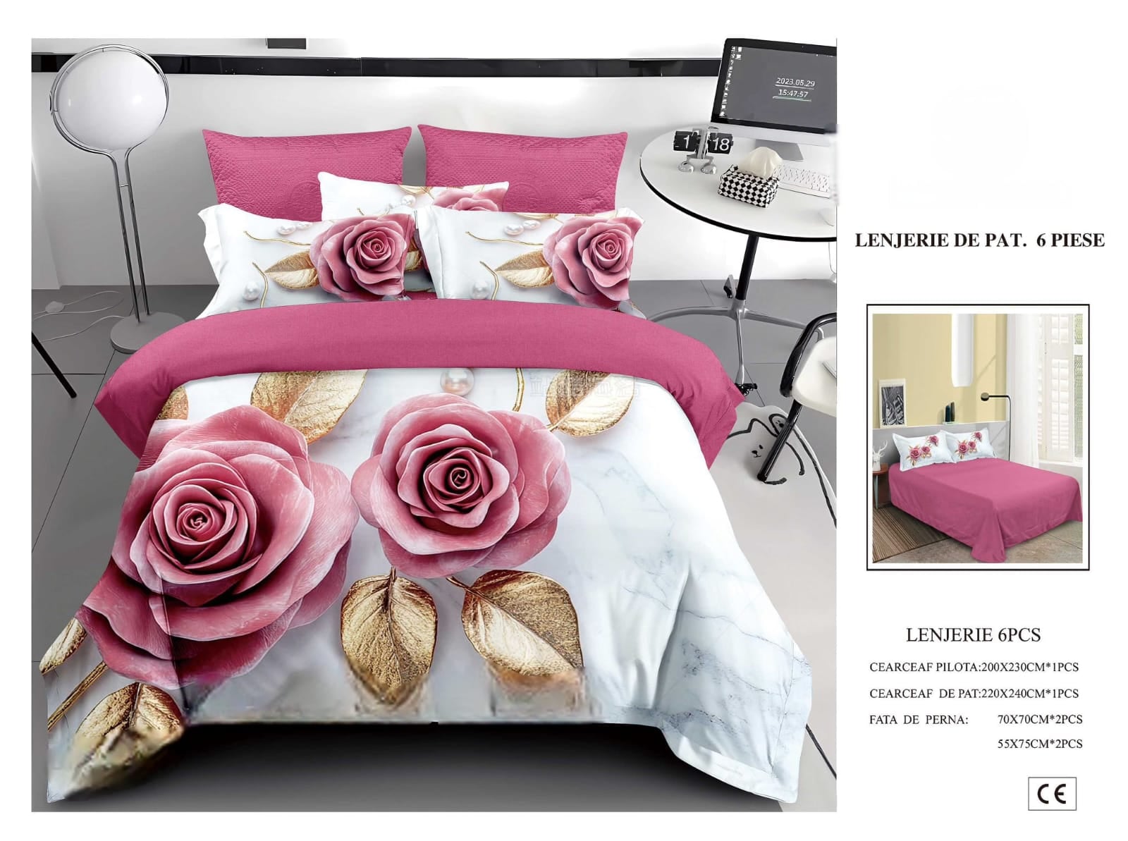 Lenjerie De Pat Finet 6 Piese 5D - Trandafiri Roz Si Petale Aurii